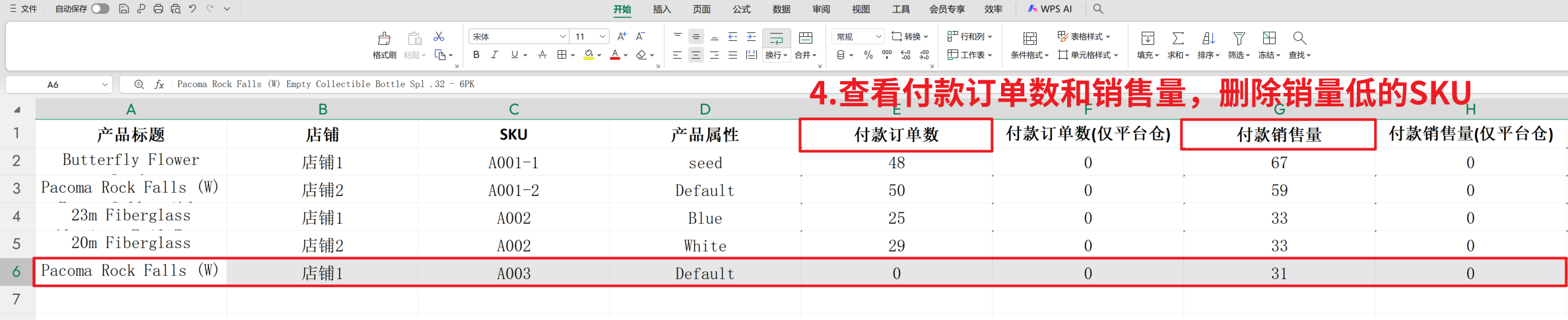 第二步:【表格中,可保留销量好的产品SKU,删除销量低的SKU】