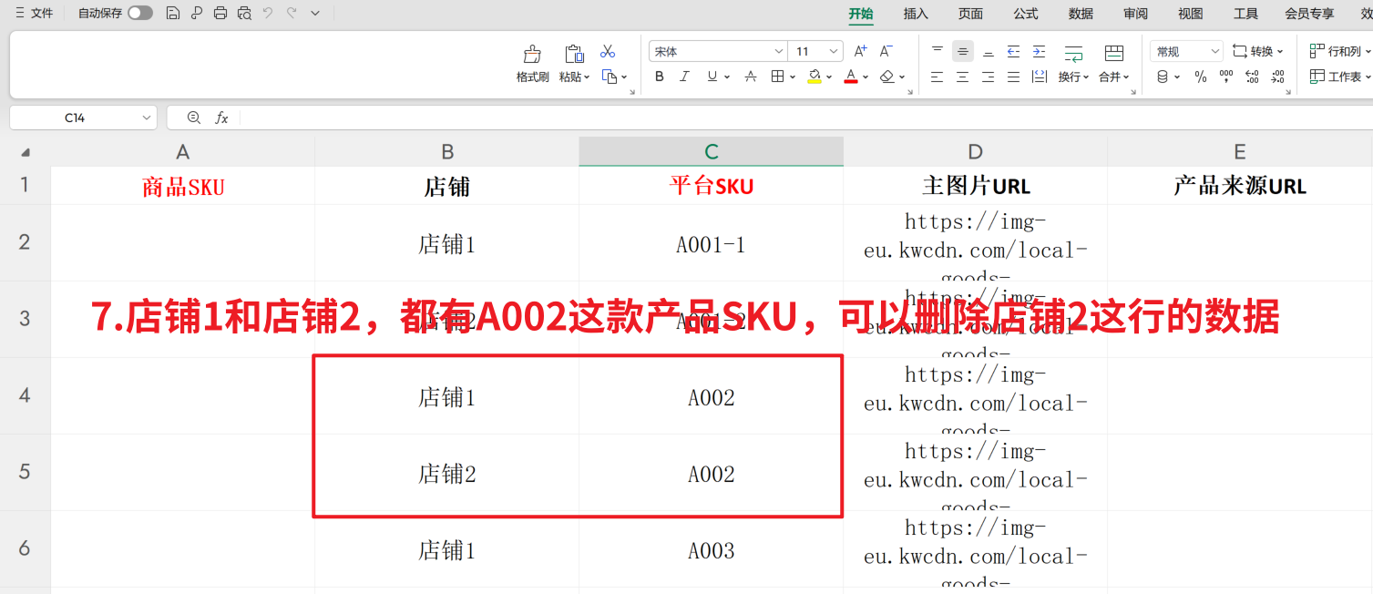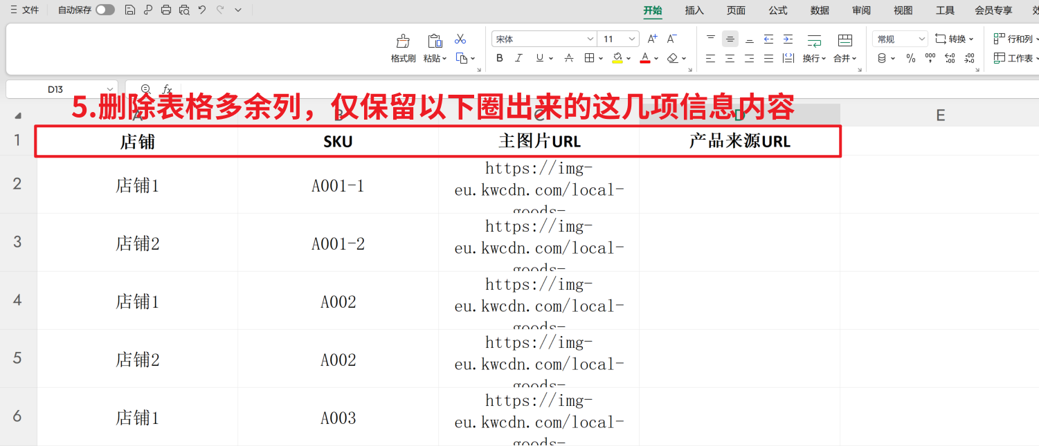 第三步:【删除表格多余列,仅保留 “店铺”、“SKU”、“主图片URL”、“产品来源URL” 】