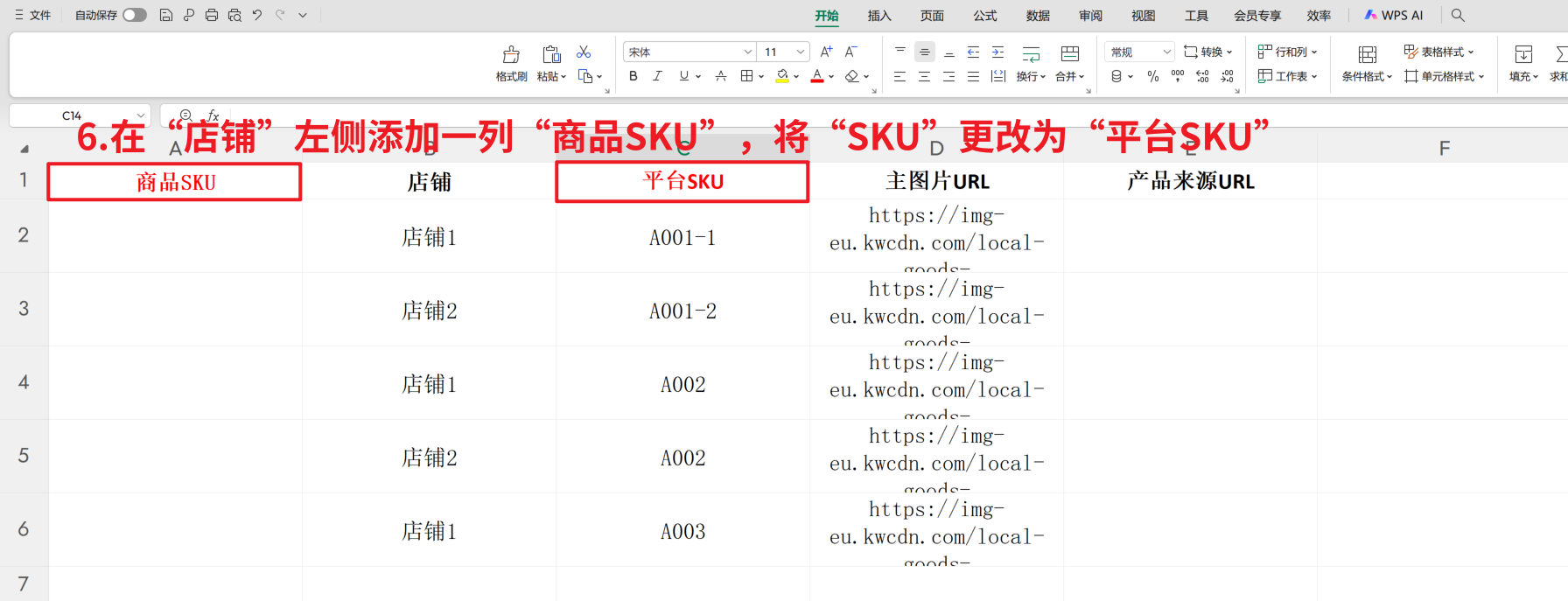 第四步:【为了方便查看商品匹配关系,可以在“店铺”列前加一列“商品SKU”,将“SKU”改为“平台SKU”】
