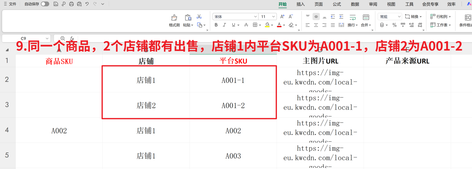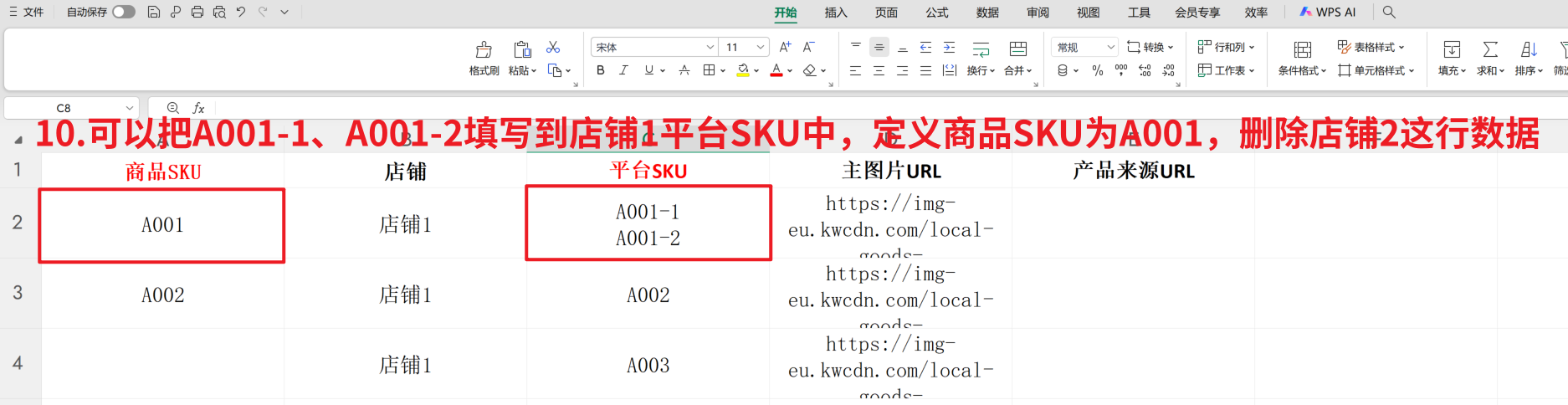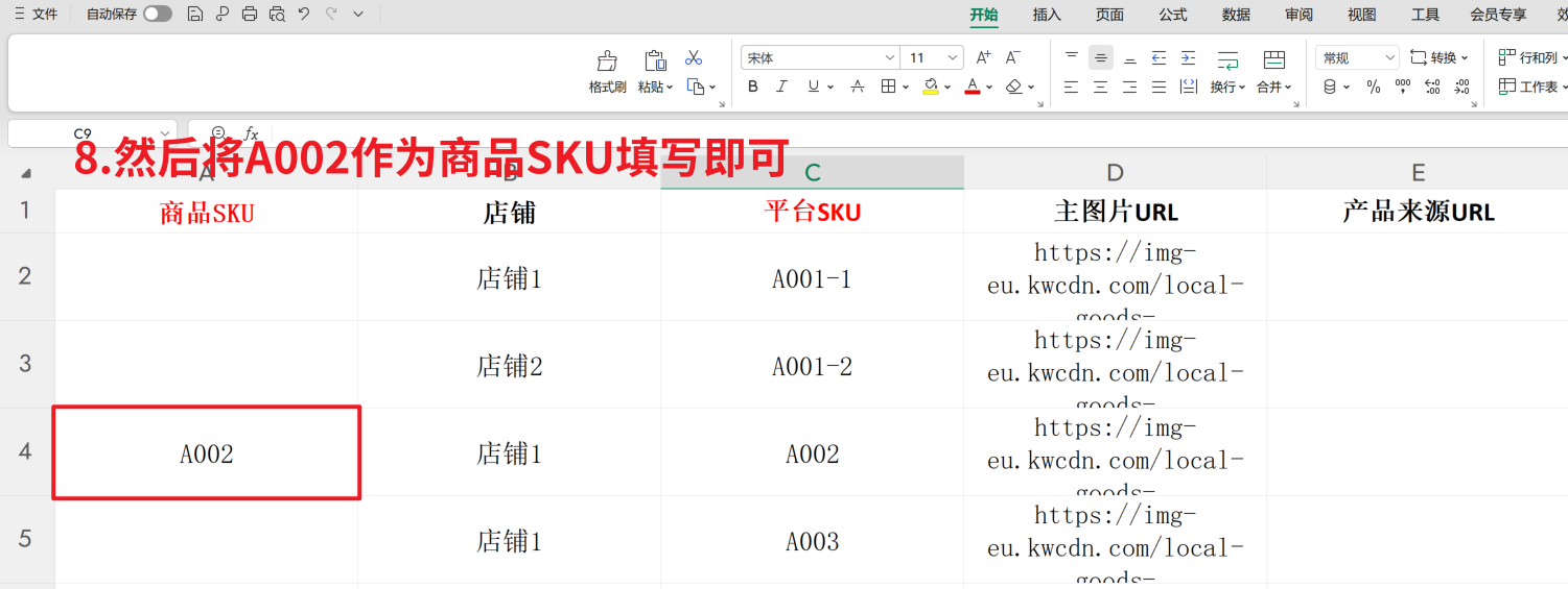 此时,就可以删除店铺2这行的数据,然后将A002作为商品SKU填写即可