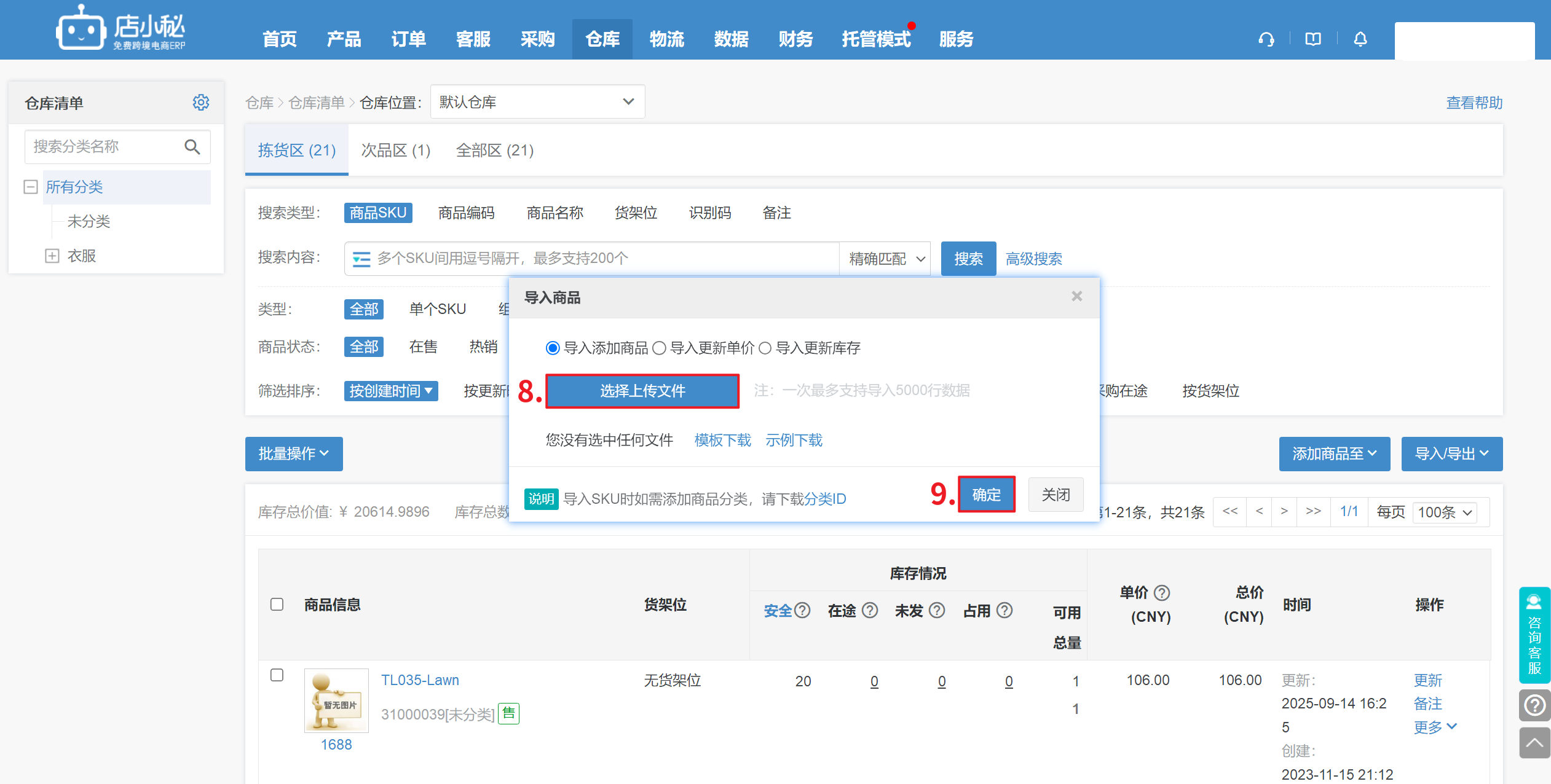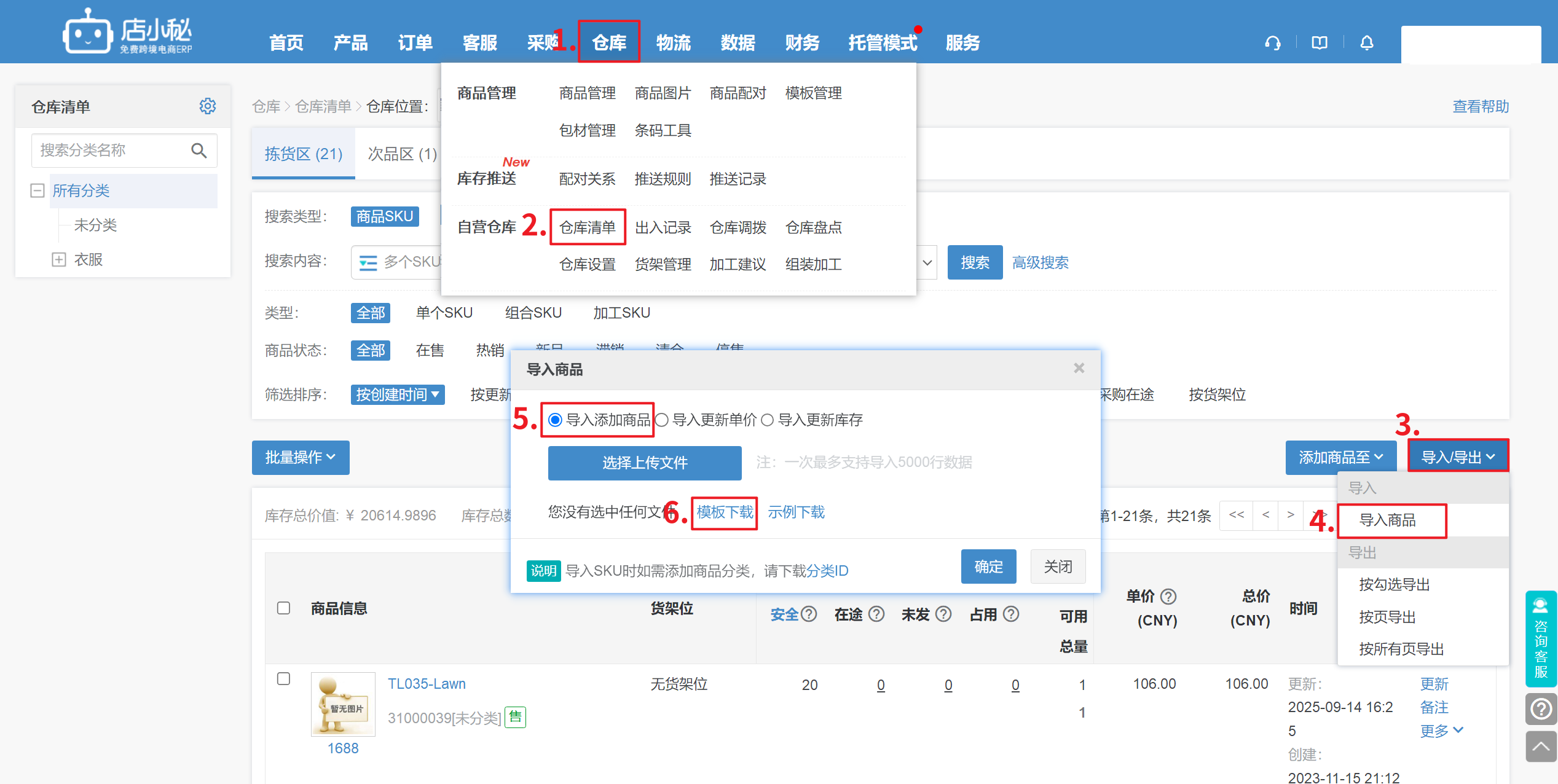 第七步:【仓库—仓库清单—导入商品—导入添加商品—模板下载】