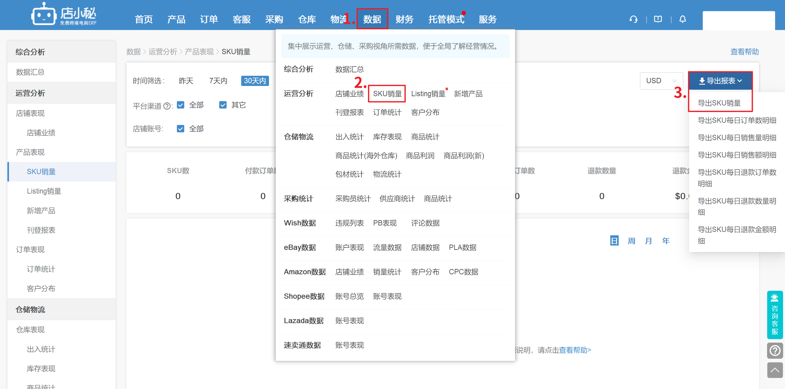第一步:【数据—SKU销量—导出报表—导出SKU销量】
