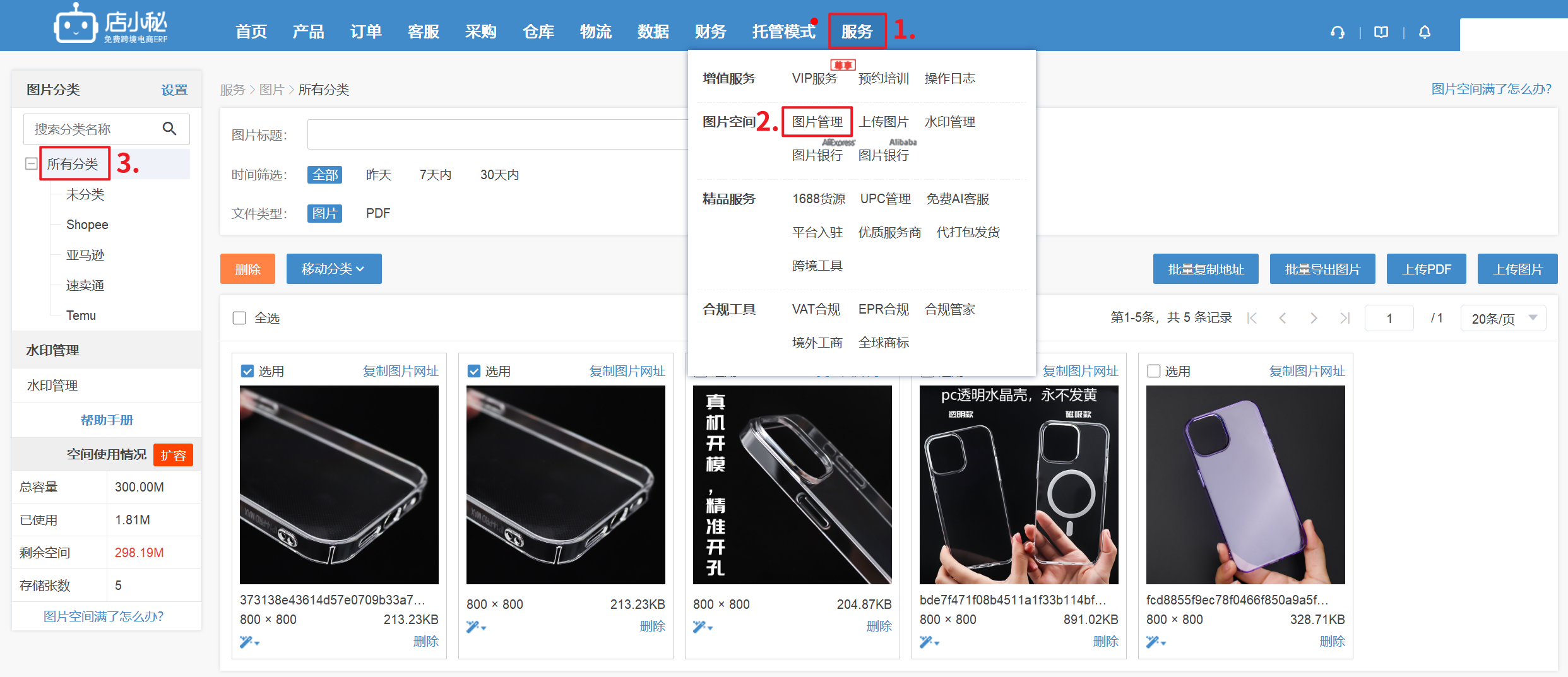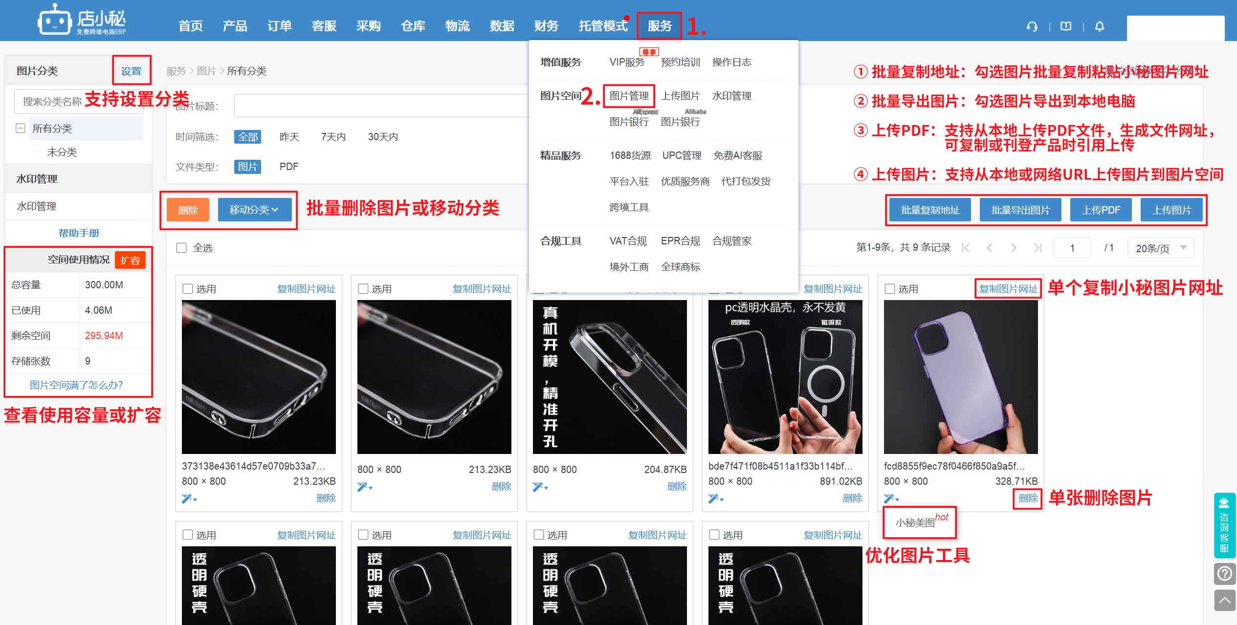 免费额度: 300M (图片空间基于腾讯云服务器,每1M成本均由店小秘承担,超出免费额度需付费扩容)