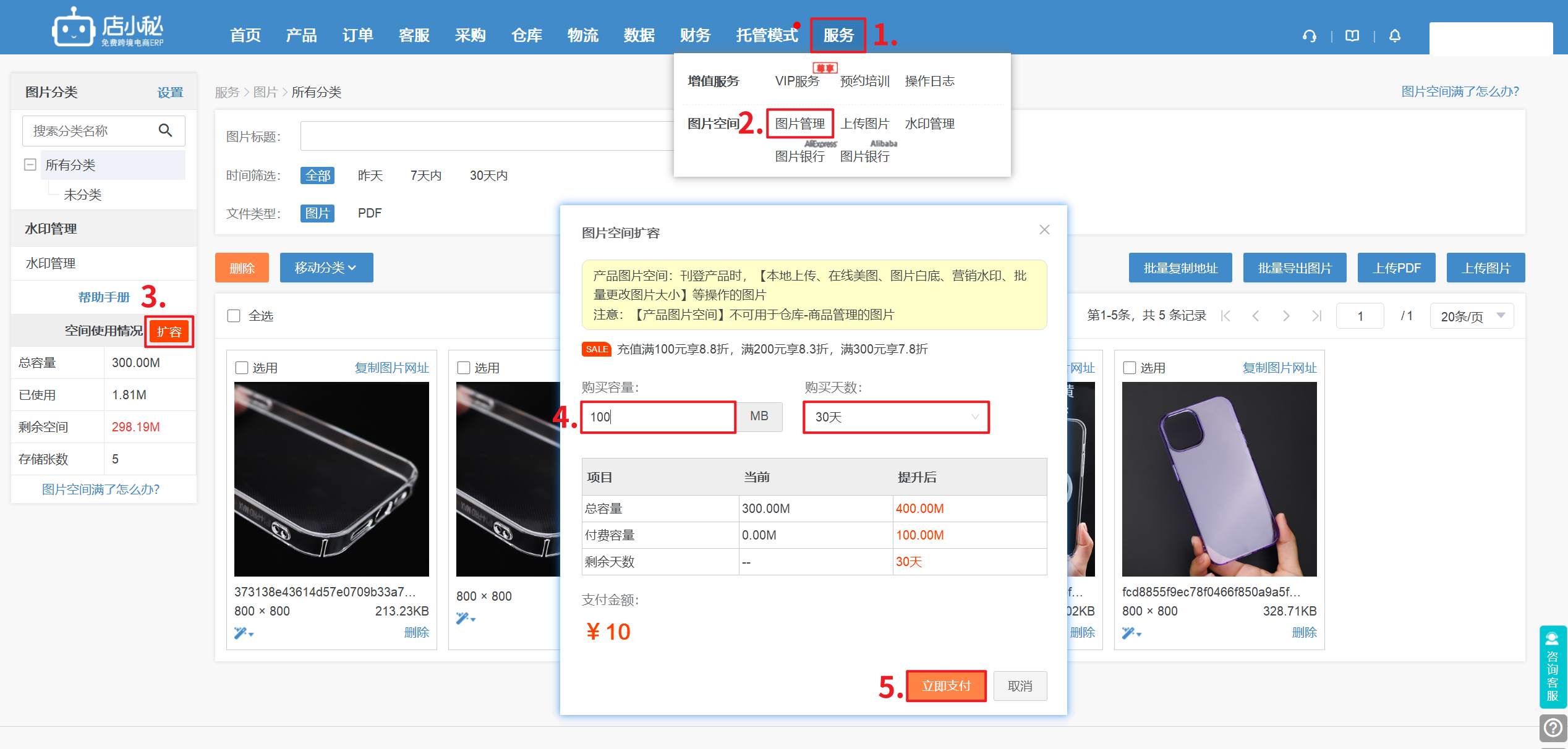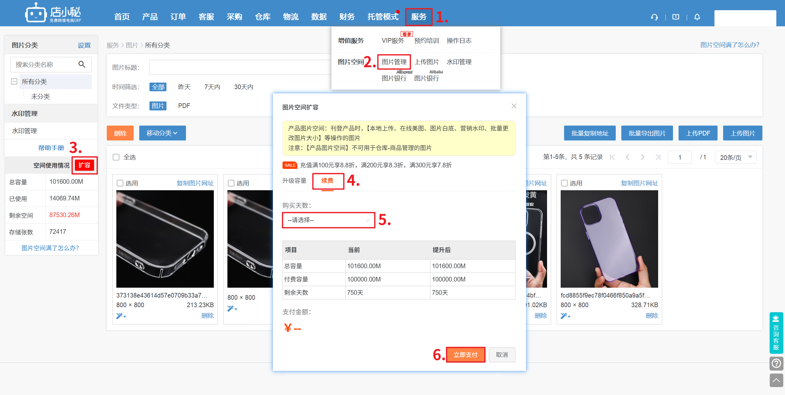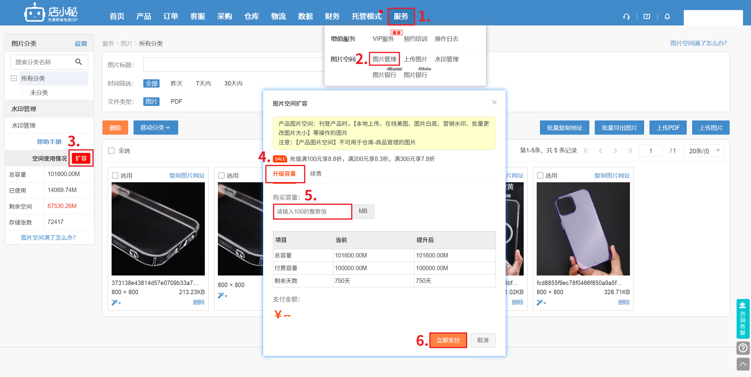 路径:【服务—图片管理—点击扩容—选择购买空间的容量和时间,支付即可】