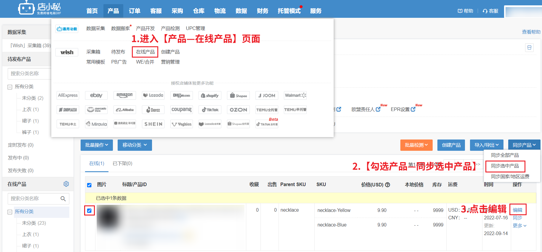A1:① 进入【产品—在线产品】页面,然后【勾选产品—同步选中】产品