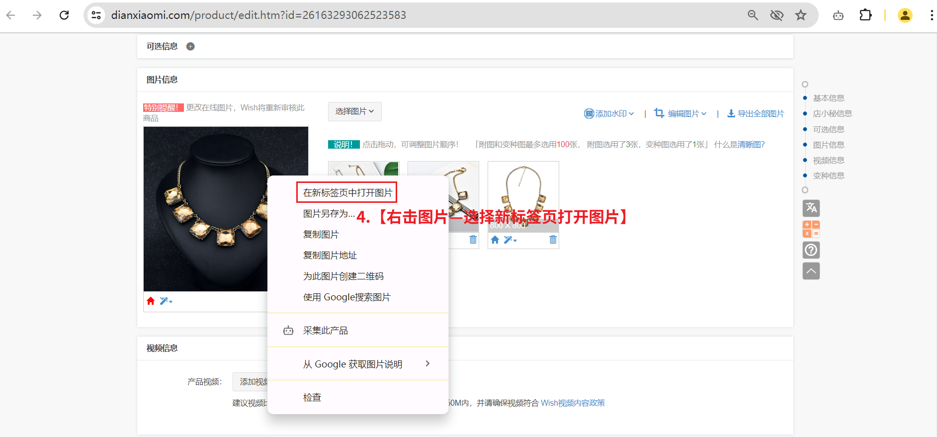 ② 找对应时间发布的产品,点击编辑,【右击图片—新标签页打开图片】,看下图片网址