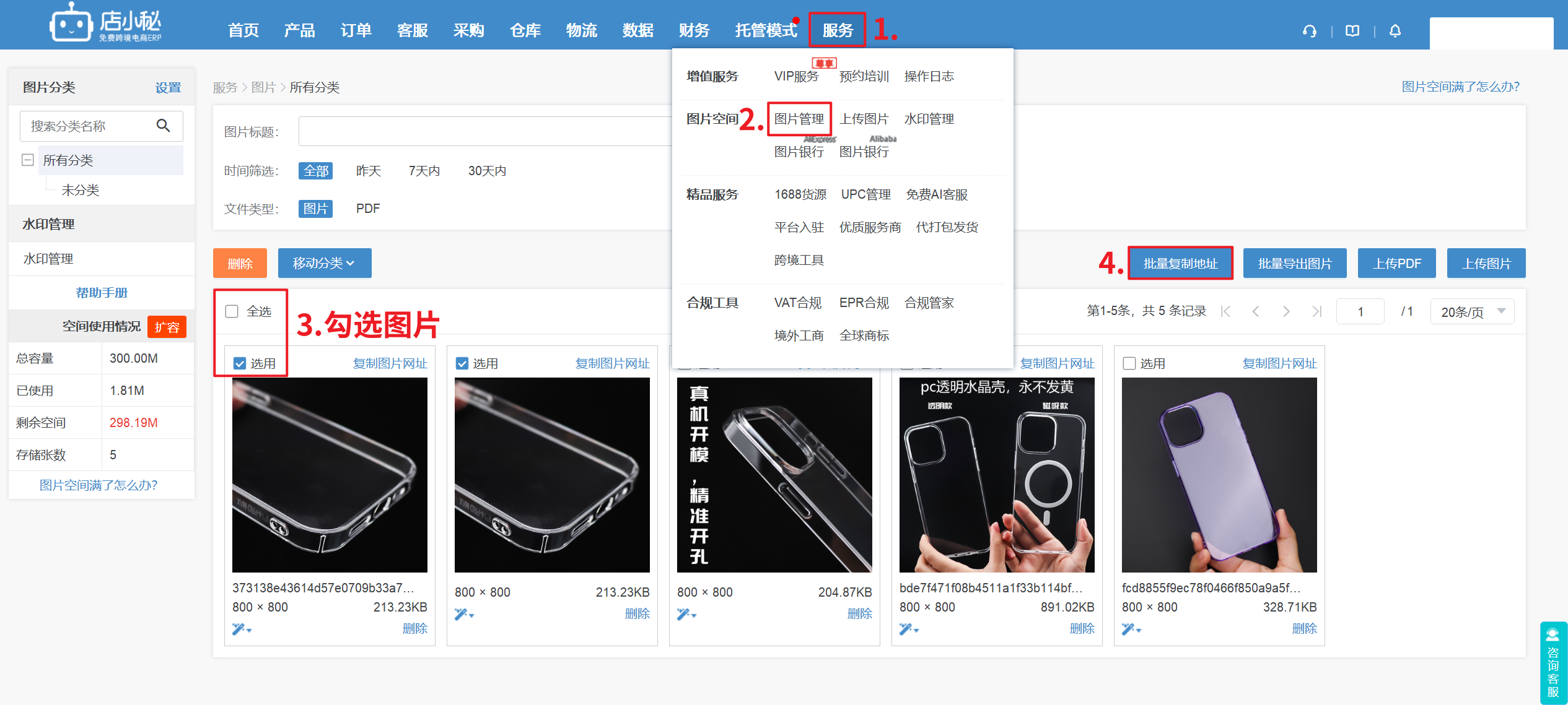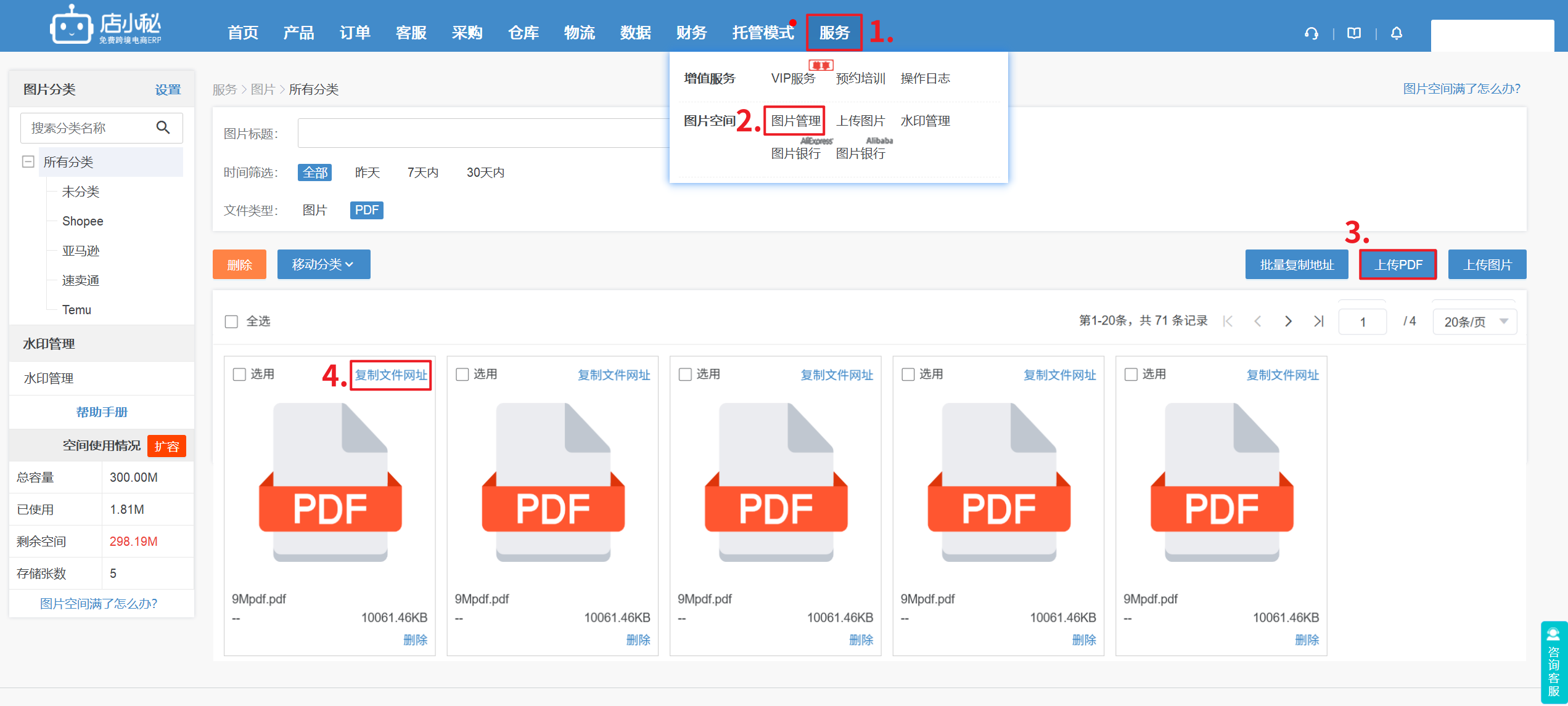 A4:【服务—图片管理—上传PDF—单个/批量复制文件网址】