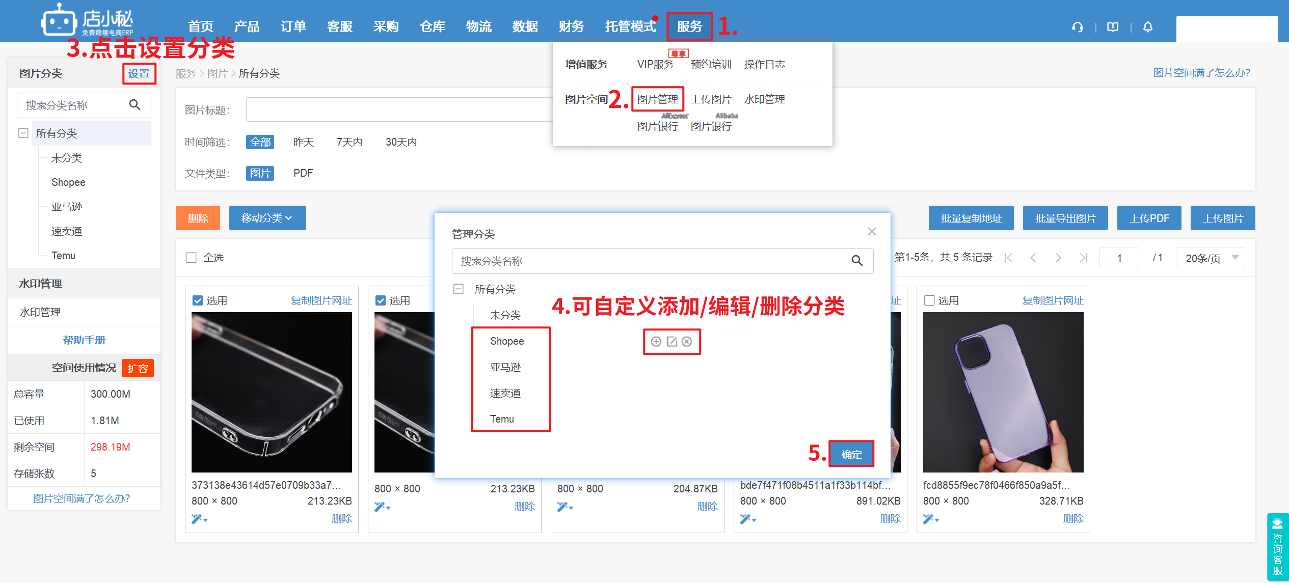 2、【服务—图片管理—设置—可以创建多个分类,分别以平台命名,上传产品时,先将产品图片上传到图片空间,