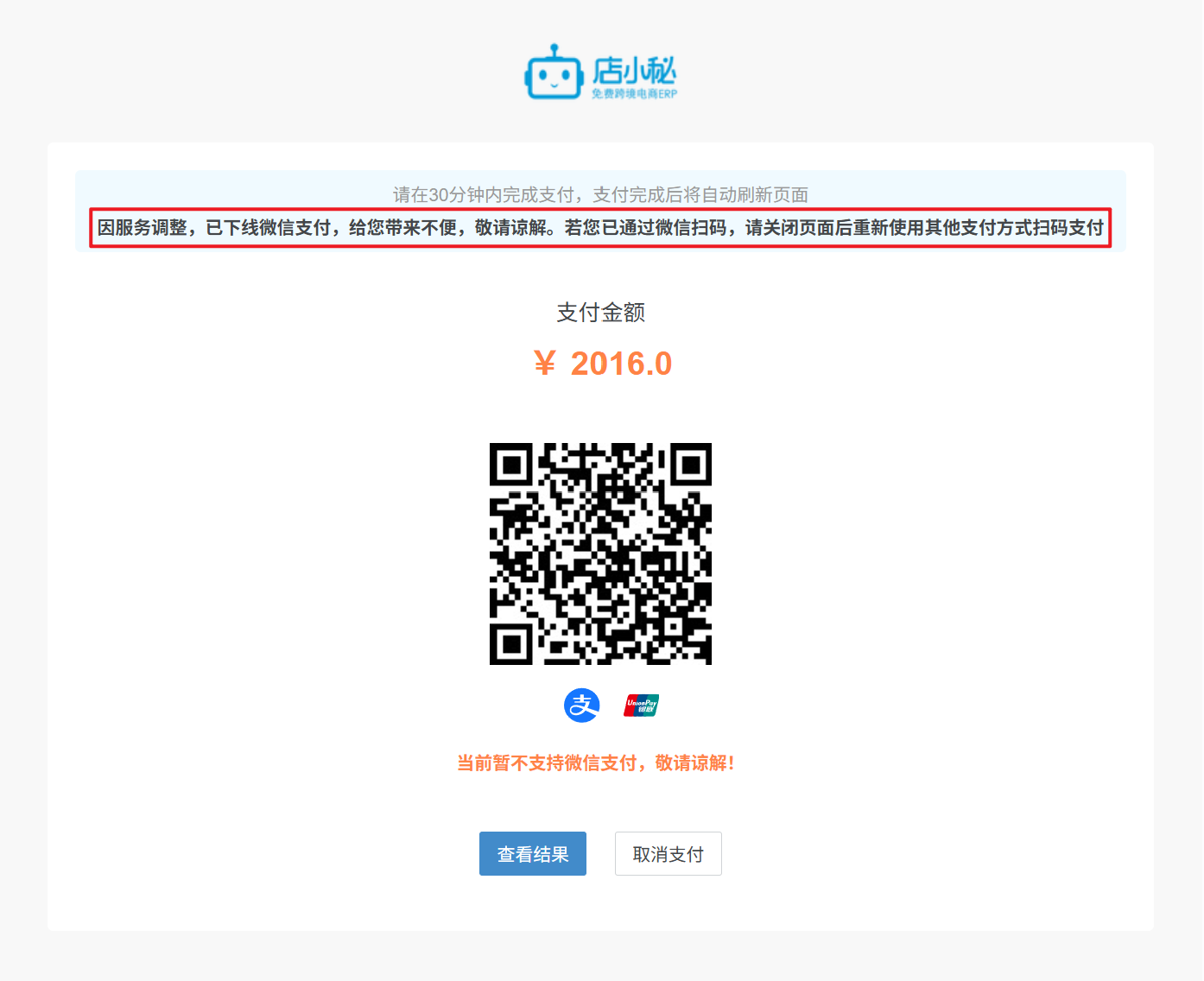 A1:因服务调整,已下线微信支付,给您带来不便,敬请谅解,您可选择其他支付方式完成支付(支付宝、银联卡或Shopify Bill)
