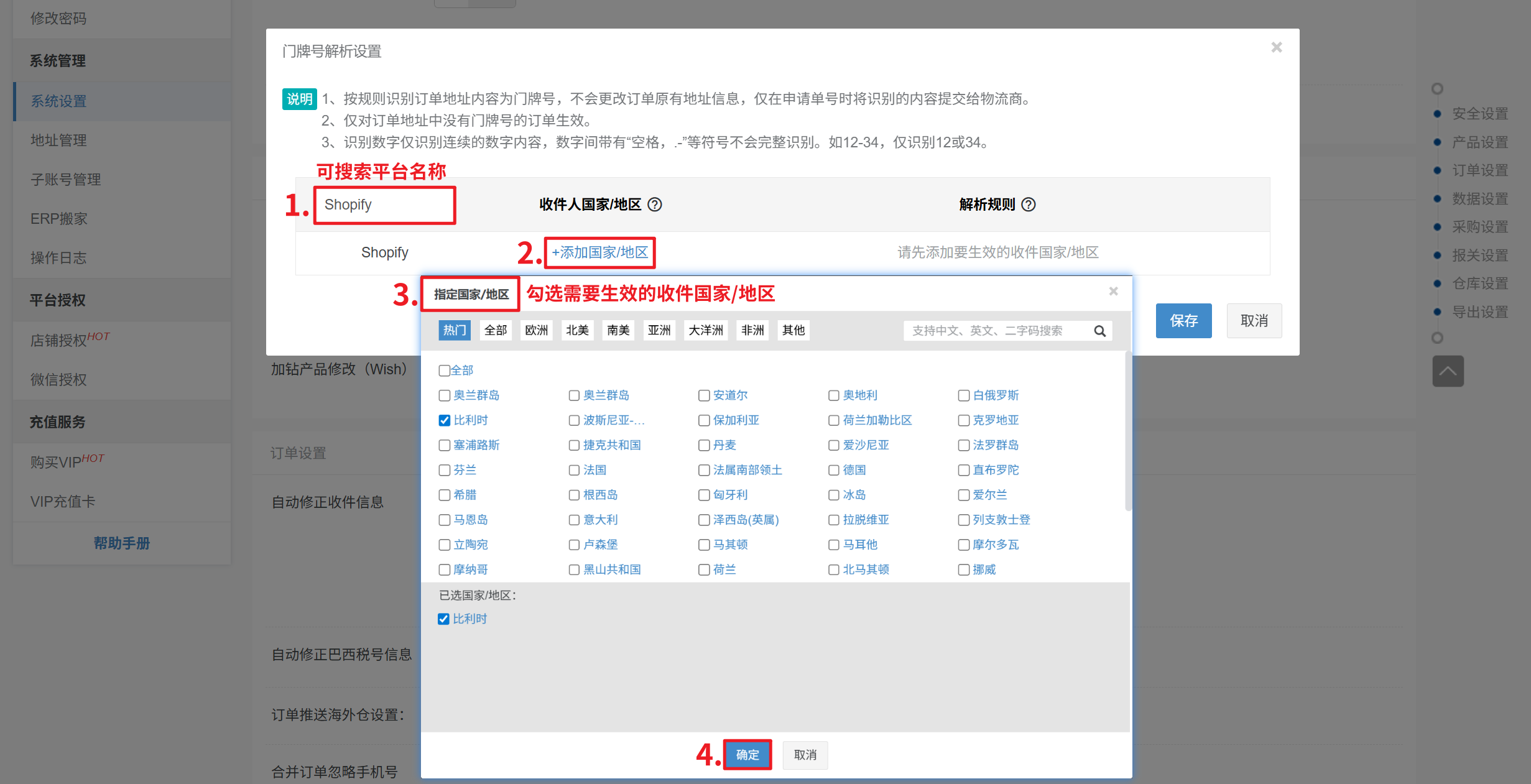 第二步:【点击添加国家/地区—勾选需要生效的收货国家/地区—保存】