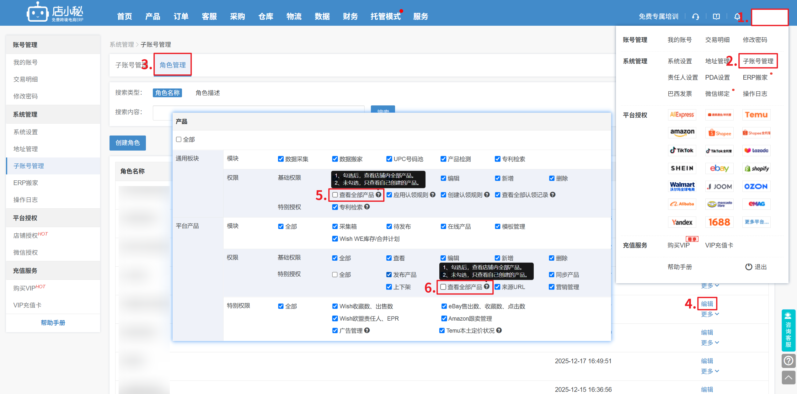 注意:1、子账号拥有所有勾选产品所属店铺的权限才支持分配产品