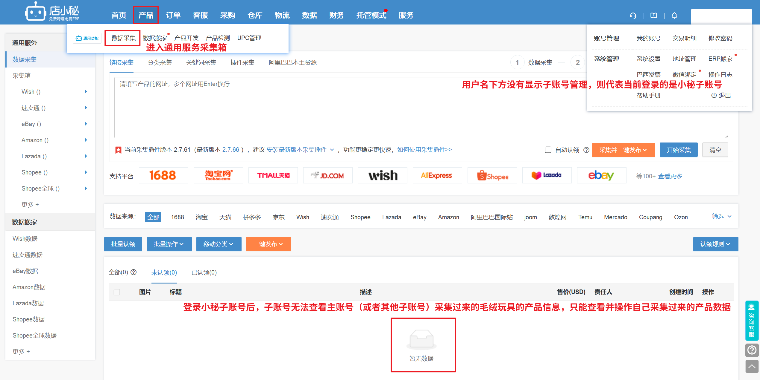 认领至各个平台采集箱,子账号查看视角: