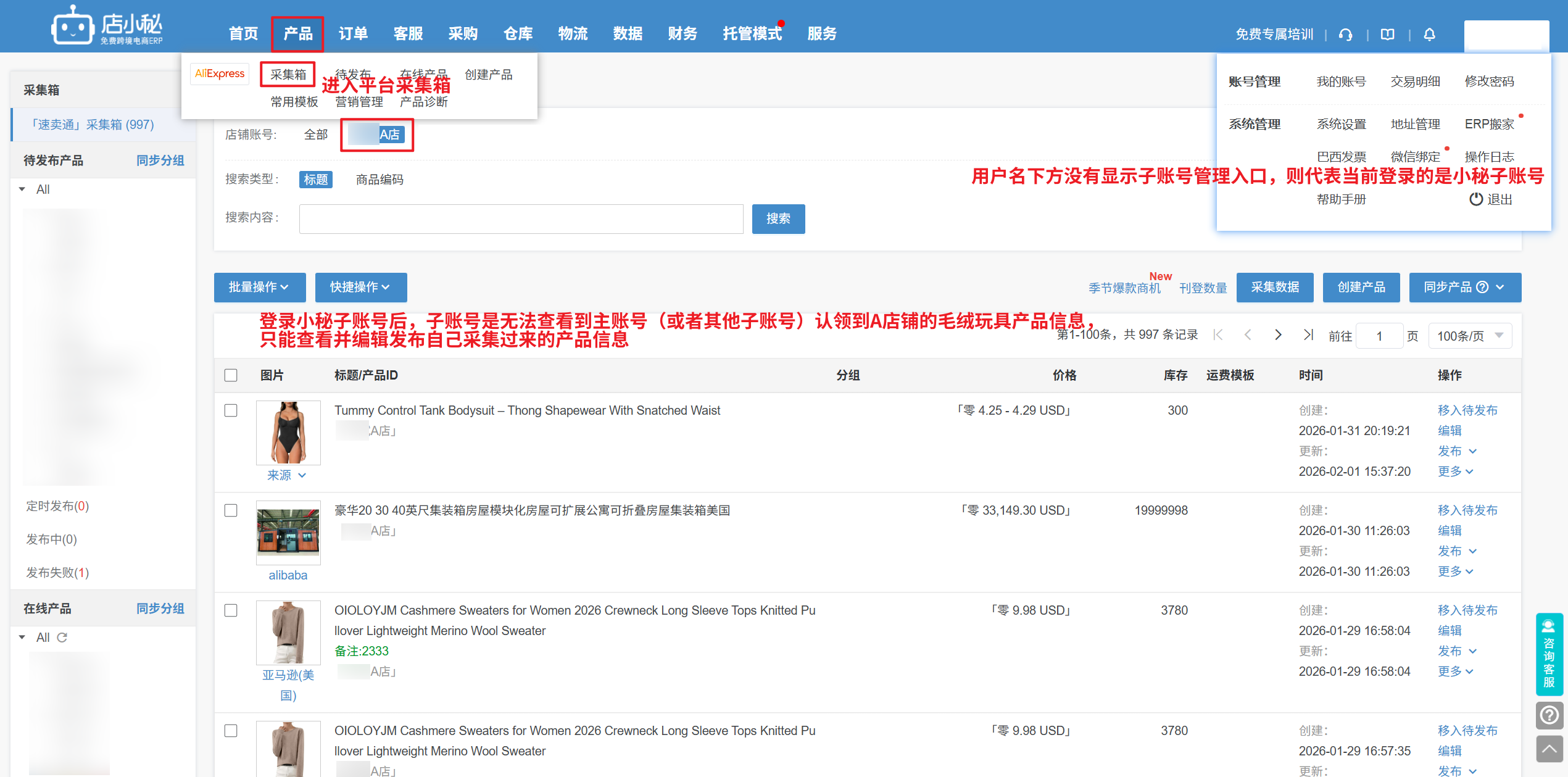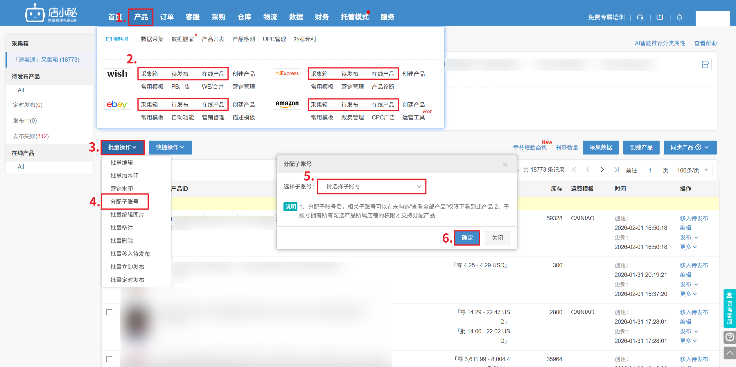 A1:【登录小秘主账号用户名—采集箱/待发布/在线产品—勾选产品—批量操作—分配子账号—选择子账号—确定】