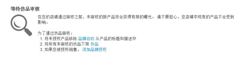 当Wish平台首页提示“仿品审核”未通过时,说明您店铺中有仿品,已经失去了“诚信店铺”的资格,需要重新提交仿品审核。