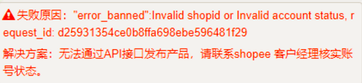 Shopee店铺已被冻结,通过店铺后台能正常发布,但是通过API接口发布会报错;