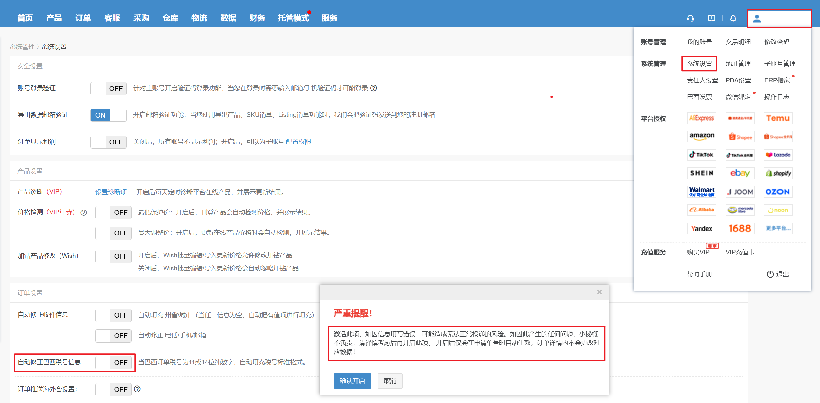 2、如果是巴西的订单,【登录小秘主账号—用户名—系统设置—启用自动修正巴西税号信息—确认开启—点击获取跟踪号】