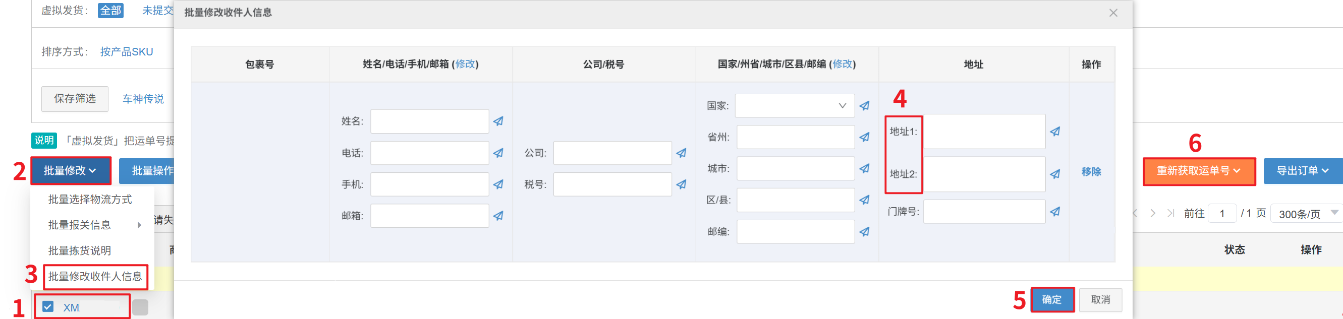 1、【勾选订单—批量修改—批量修改收件人信息—将税号填写到地址1信息的最后面,与地址1用空格隔开