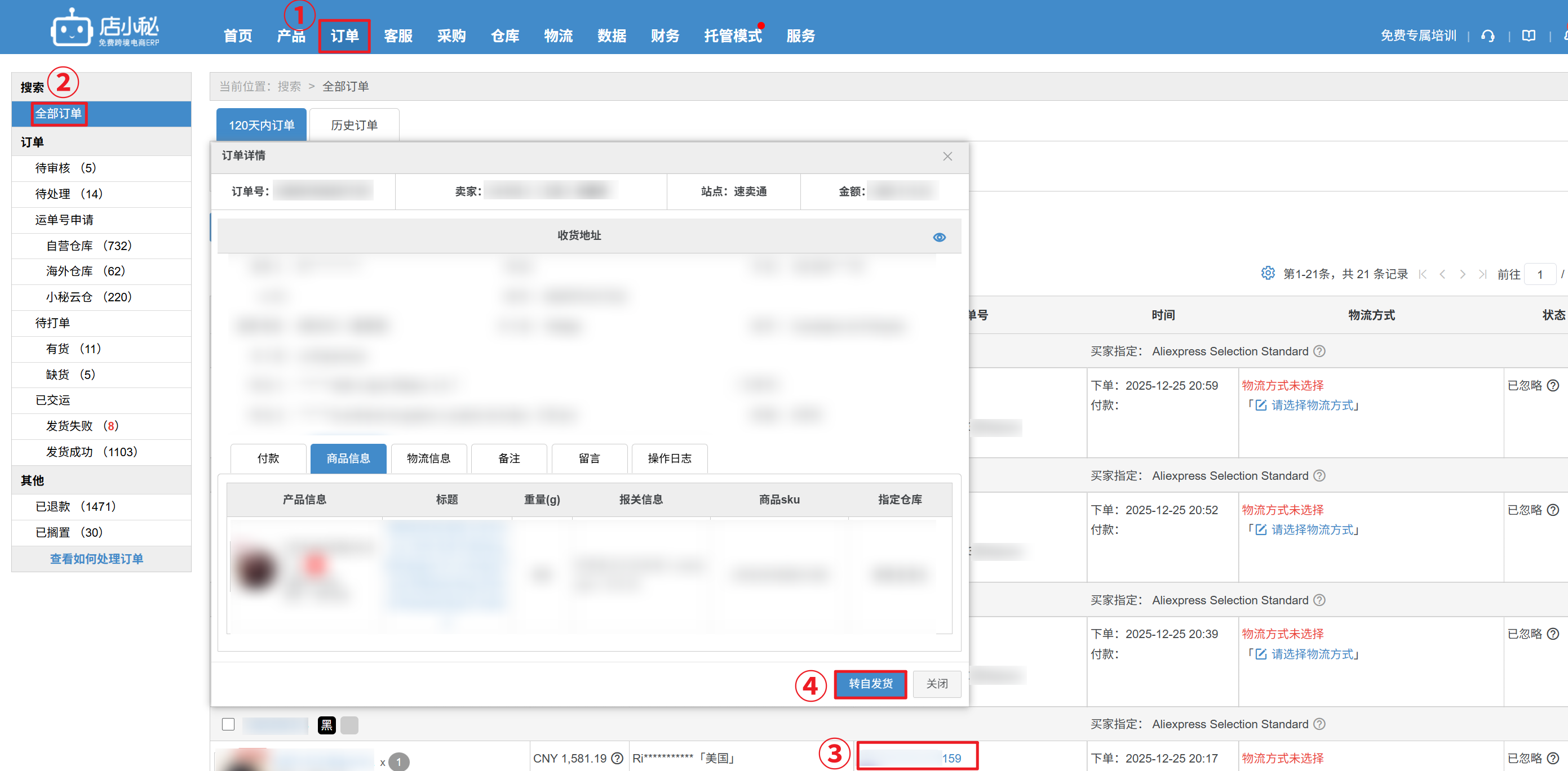 Q1:速卖通官方仓发货的订单,已经在店铺后台操作转商家自发货处理了,在店小秘如何处理?