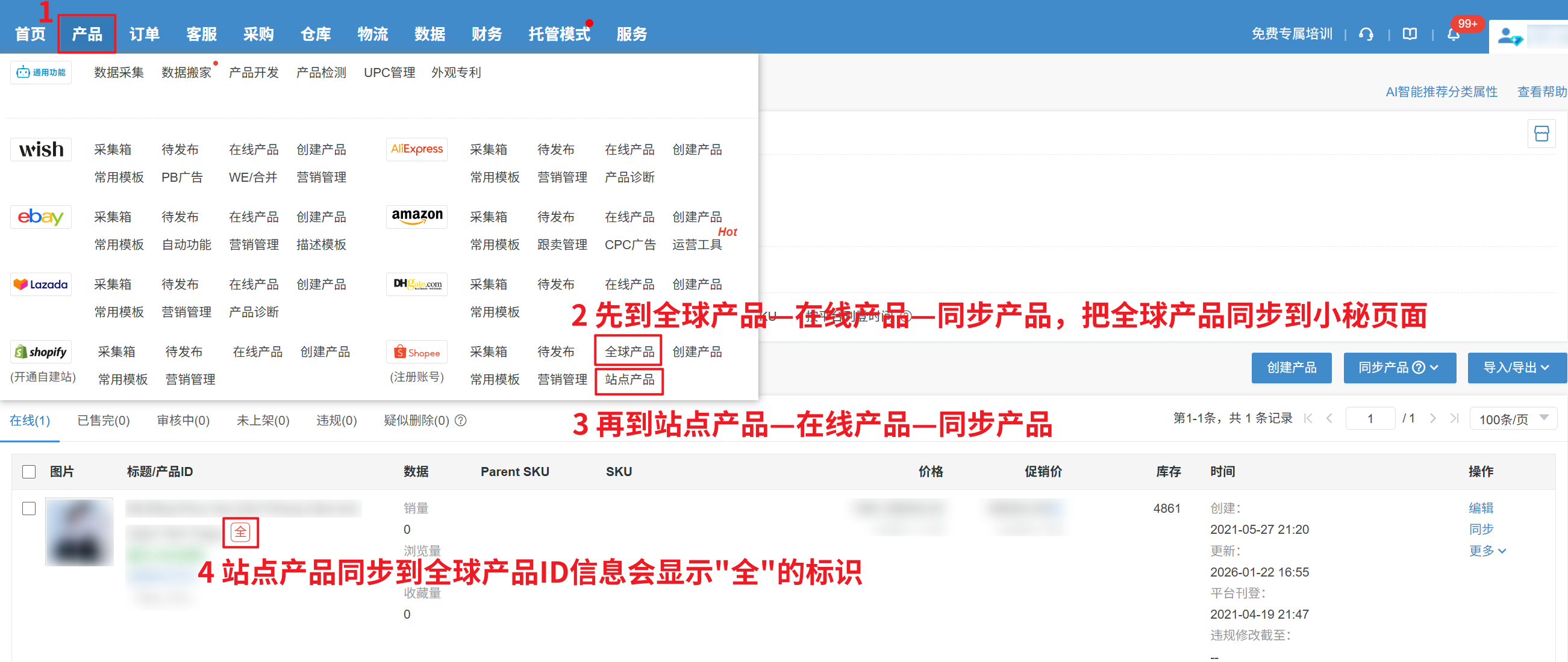 原因:升级为全球店铺之前,通过站点店铺直接发布的产品 Shopee会在全球店铺默认生成一份,站点产品需要和全球产品关联后,才能正常修改解决方案:1、【产品—全球产品—在线产品—同步产品】,将Shopee全球店铺的产品同步到小秘页面 2、【产品—站点产品—同步产品】,同步到站点店铺产品对应全球产品下的ID信息,会显示“全”字标识,您再编辑修改即可