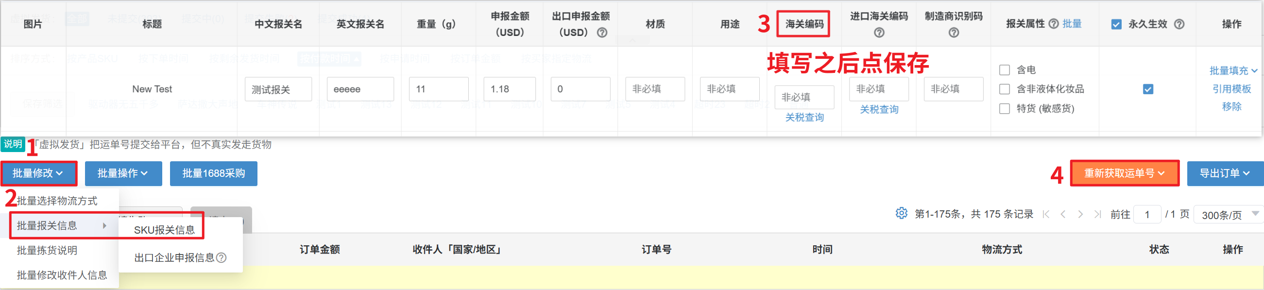 解决方案:需要完善海关编码,海关编码可在此链接查询:https://www.hsbianma.com/单个:【订单点详情—报关信息—编辑—填写海关编码—保存再申请单号】批量:【批量修改—批量报关信息—SKU报关信息—海关编码—保存】再重新获取运单号