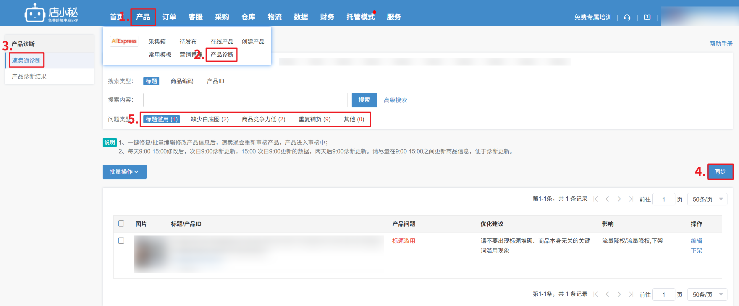 小秘每天9点过后也会自动同步一次诊断结果,也可以手动同步,速卖通后台诊断结果不出现这个产品,小秘就不会出现