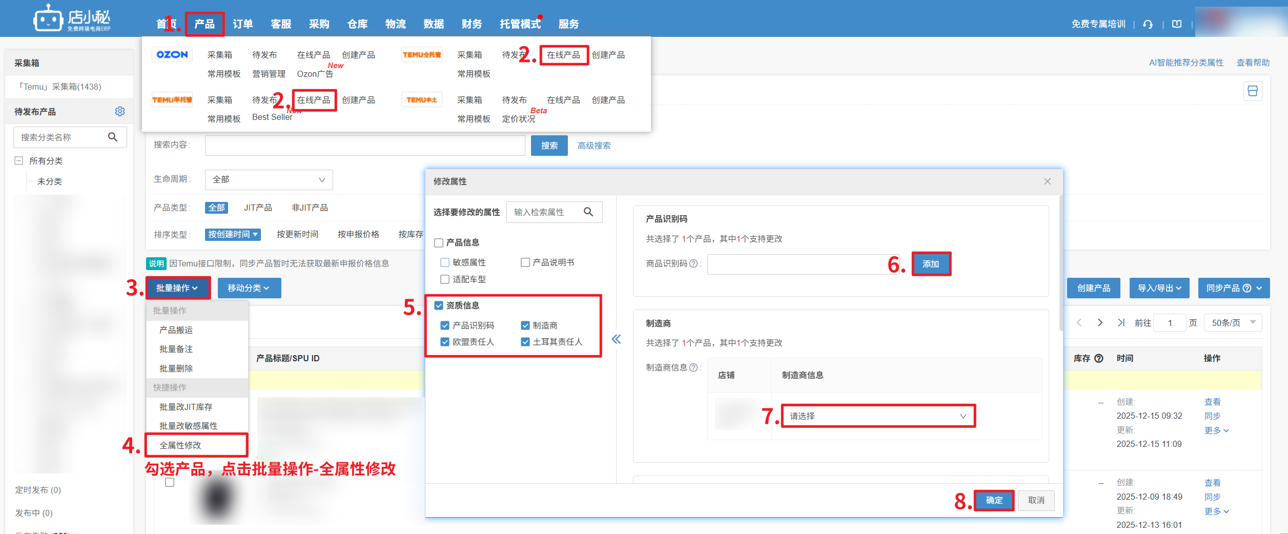 2、批量操作:【产品—在线产品—勾选产品—批量操作—全属性修改—资质信息—填写识别码、选择欧盟责任人和制造商—确定】