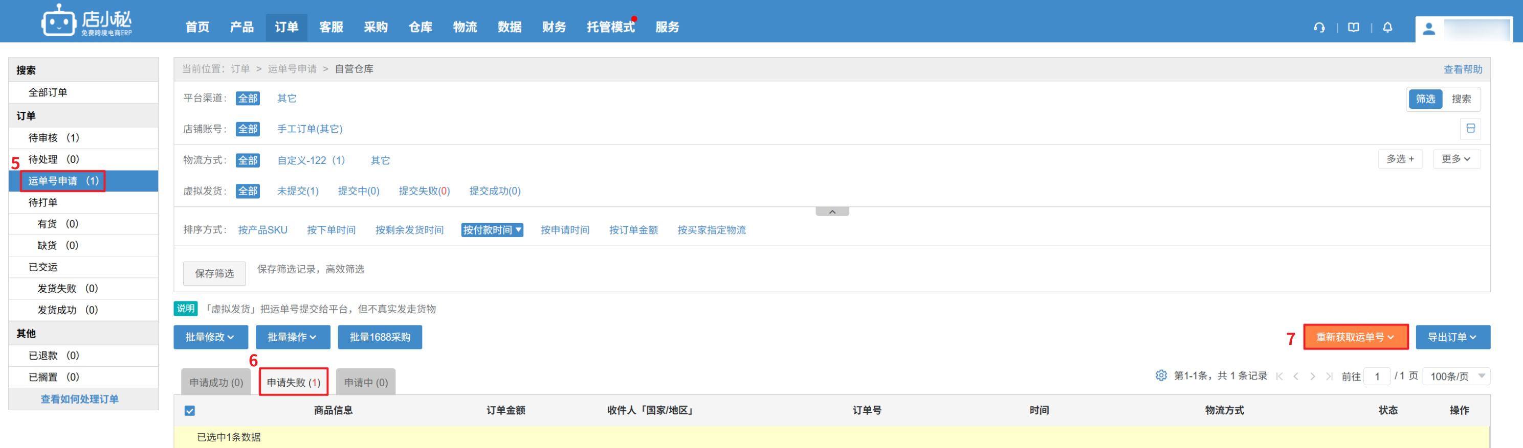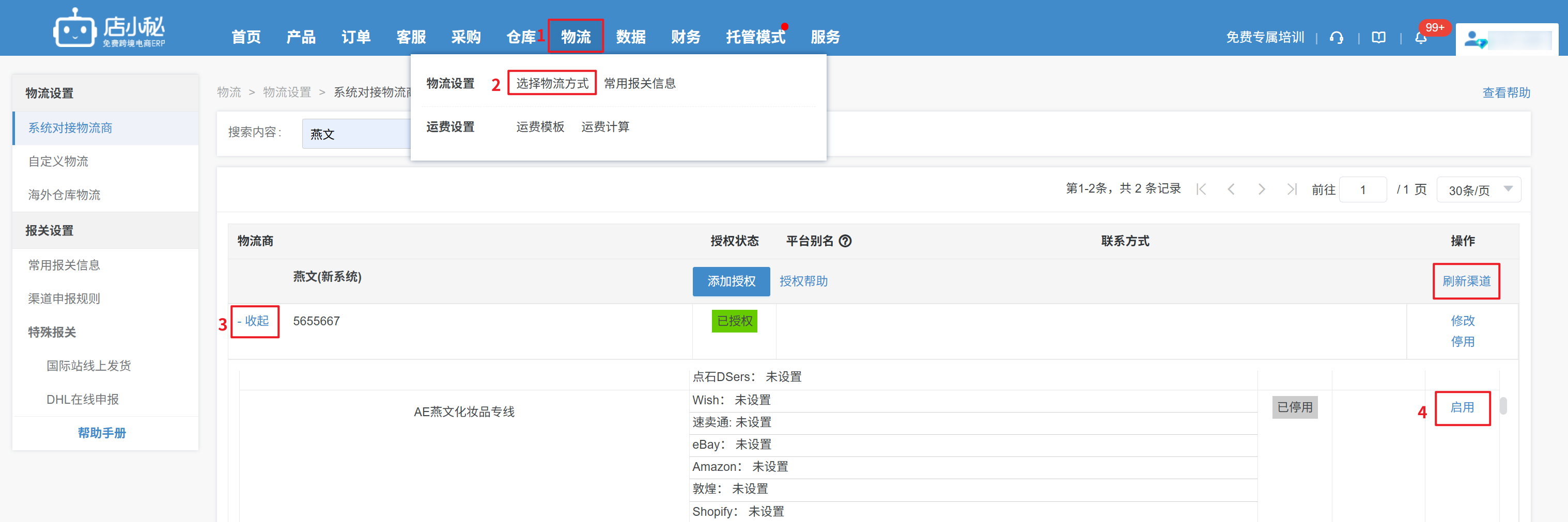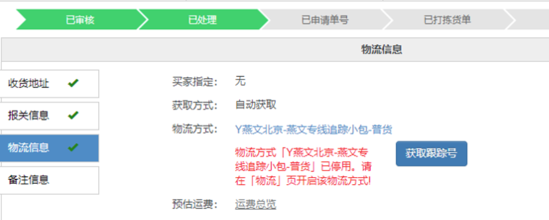 原因:物流授权的位置该物流渠道停用了或物流商更新了渠道解决方案:1、在物流下找到订单对应选择的物流渠道,启用即可2、如果渠道是已启用状态,可以停用再开启下,再重新获取单号3、如果是物流商渠道有更新,可以到物流设置点刷新渠道(如下图所示)再启用操作流程:第一步:【物流—选择物流方式—找到要走的物流渠道—启用—保存设置信息—显示已启用即可】第二步:【订单—运单号申请—申请失败—重新获取运单号】