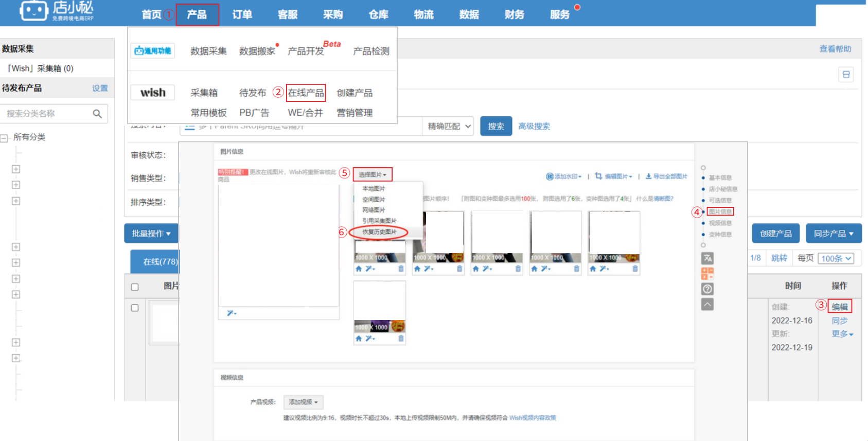 3、针对11.16号之后发布成功的产品,若Wish返回图片为空,可点击恢复历史图片