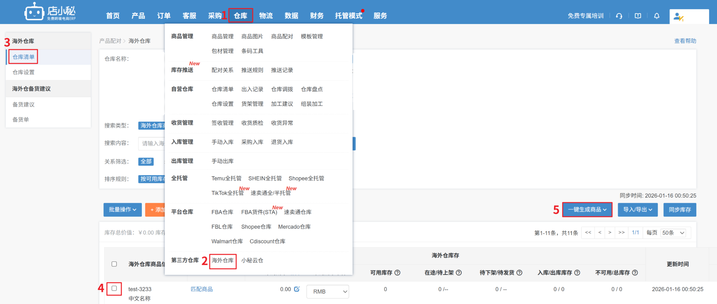 【仓库—海外仓库—仓库请单—选择仓库—同步库存—一键生成商品—生成,可直接将海外仓SKU生成仓库商品SKU,并且自动配对】