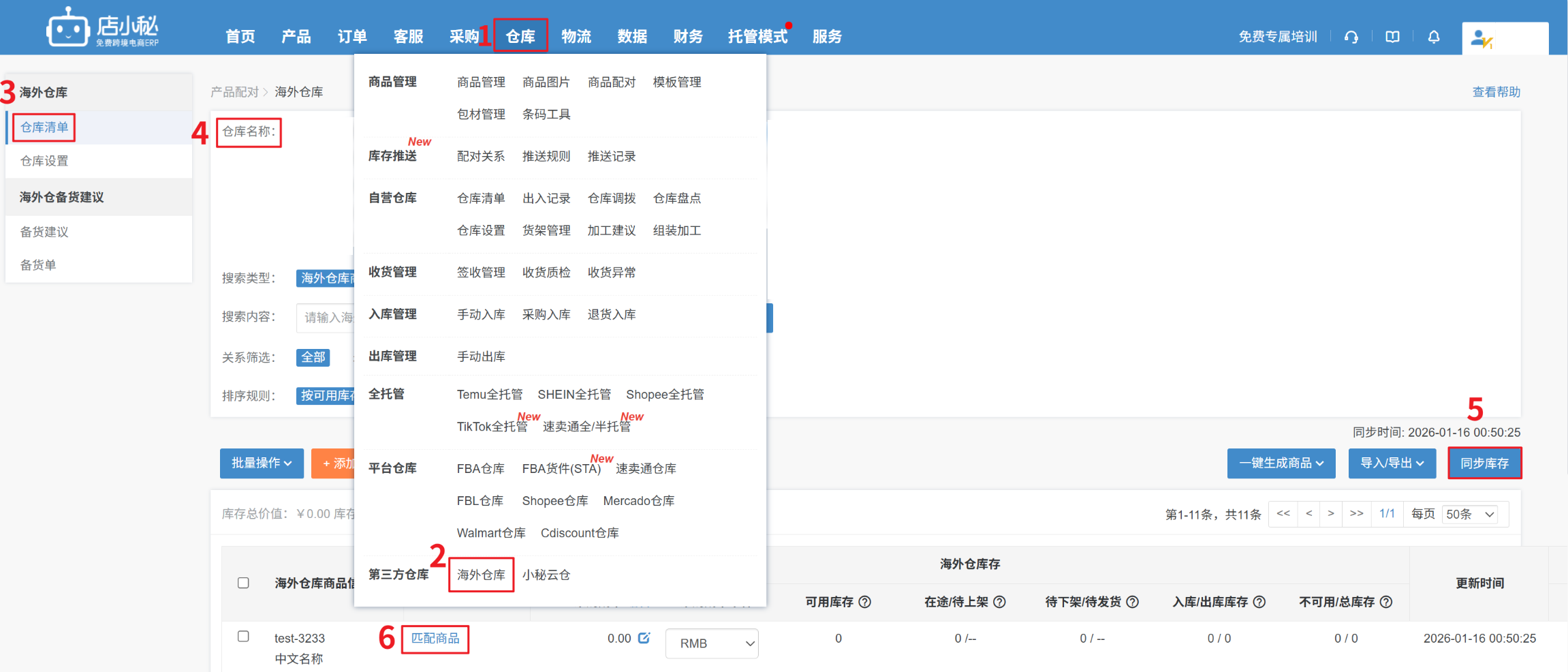 【仓库—海外仓库—仓库请单—选择仓库—同步库存—搜索海外仓SKU,点击匹配商品,选择小秘仓库要配对的商品SKU即可