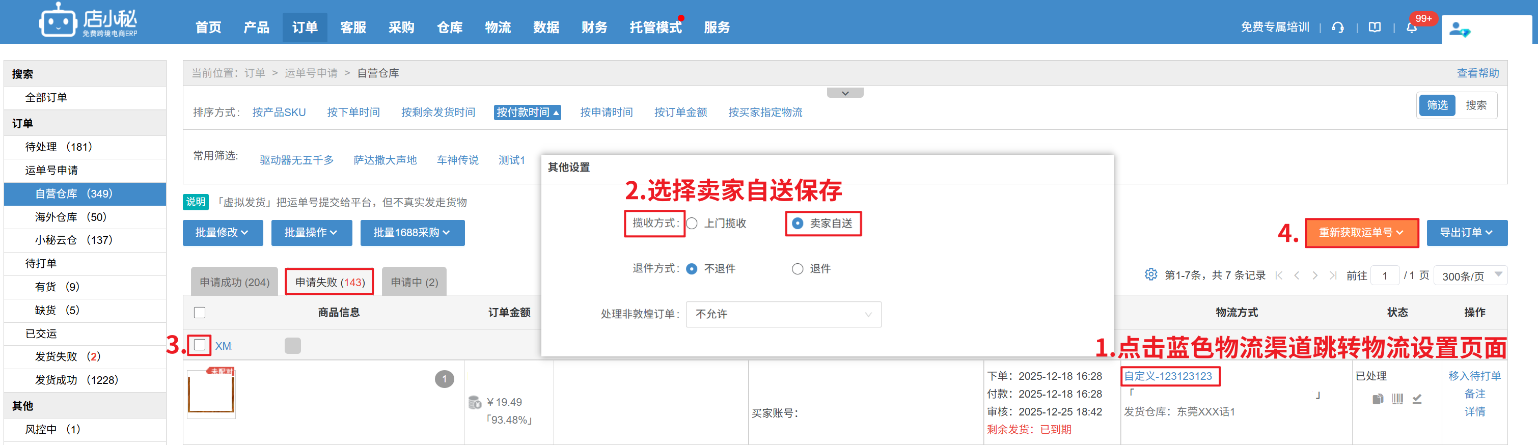 物流方式点击蓝色物流渠道跳转到物流设置页面—揽收方式选择卖家自送保存—勾选保存的订单—重新获取运单号即可