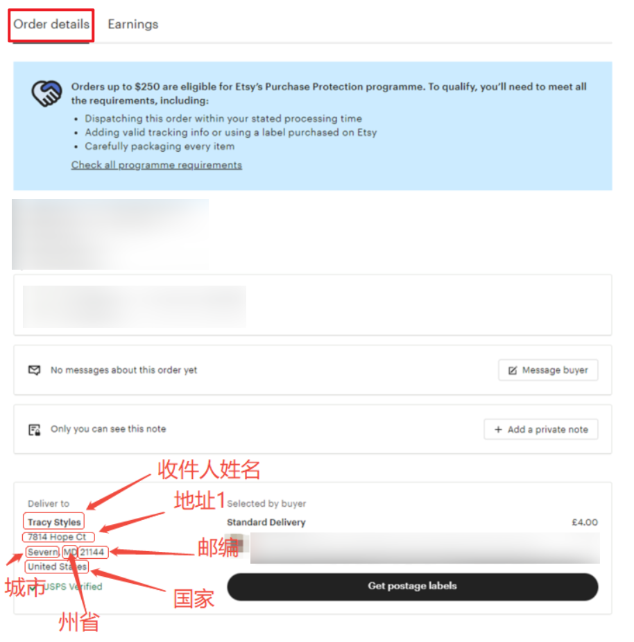 【6】采集到的订单地址信息对应:Etsy后台—Orders—New—订单详情中收件人地址信息