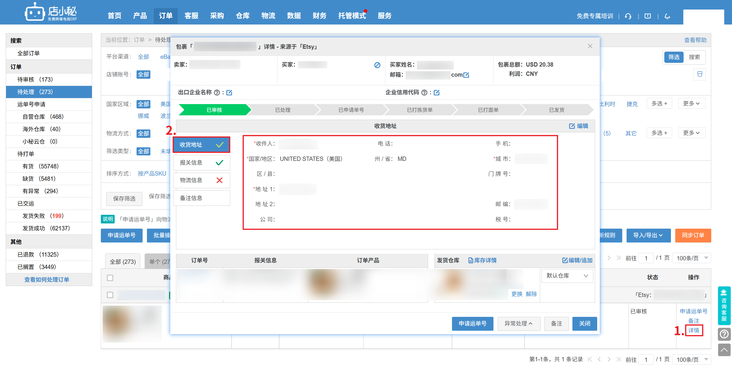通过安装店小秘采集插件,进入Etsy后台订单管理采集收件人地址信息展示到店小秘,方便查看处理订单