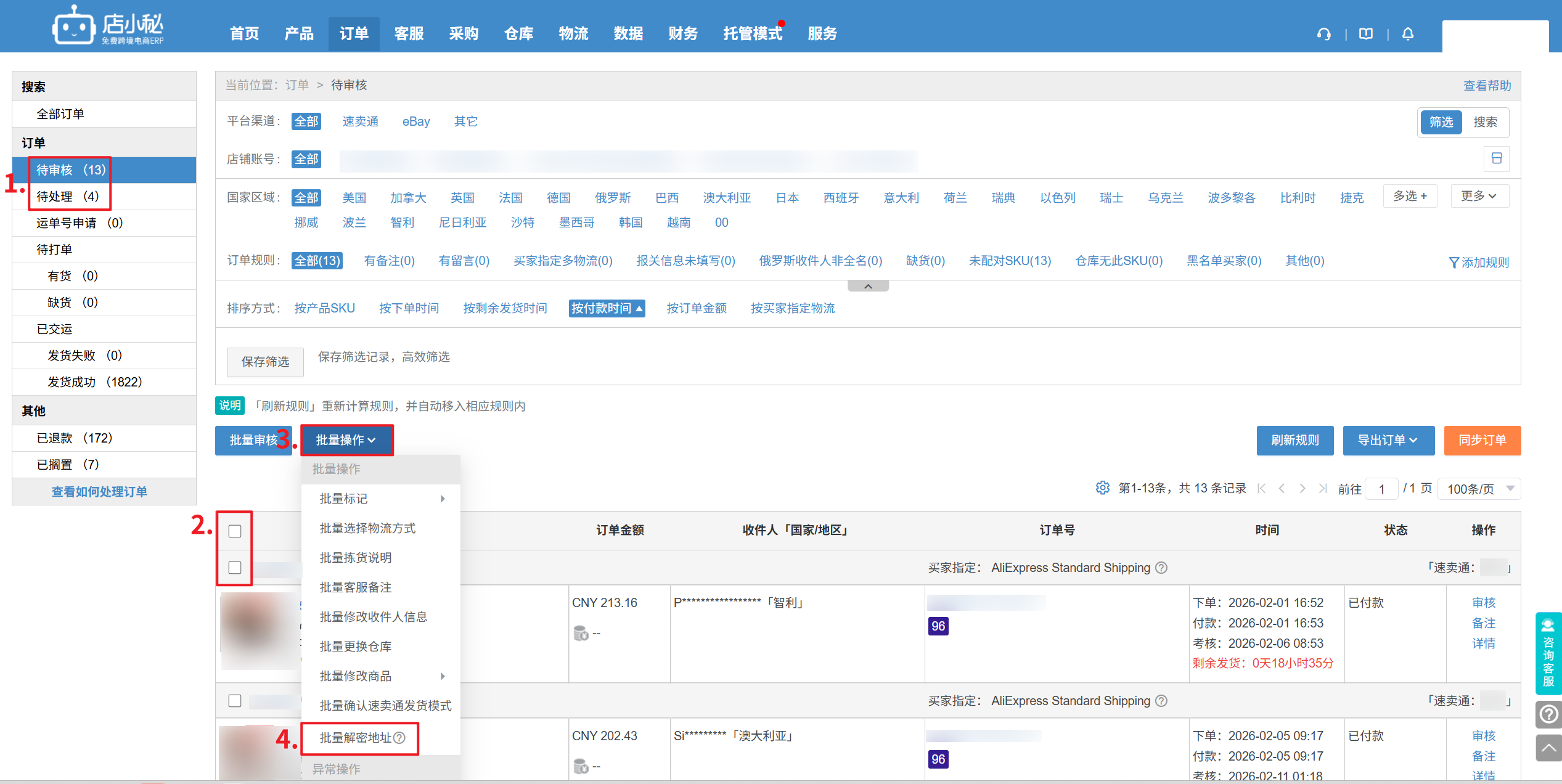 批量操作:【待审核/待处理状态—勾选订单—批量操作—批量解密地址】