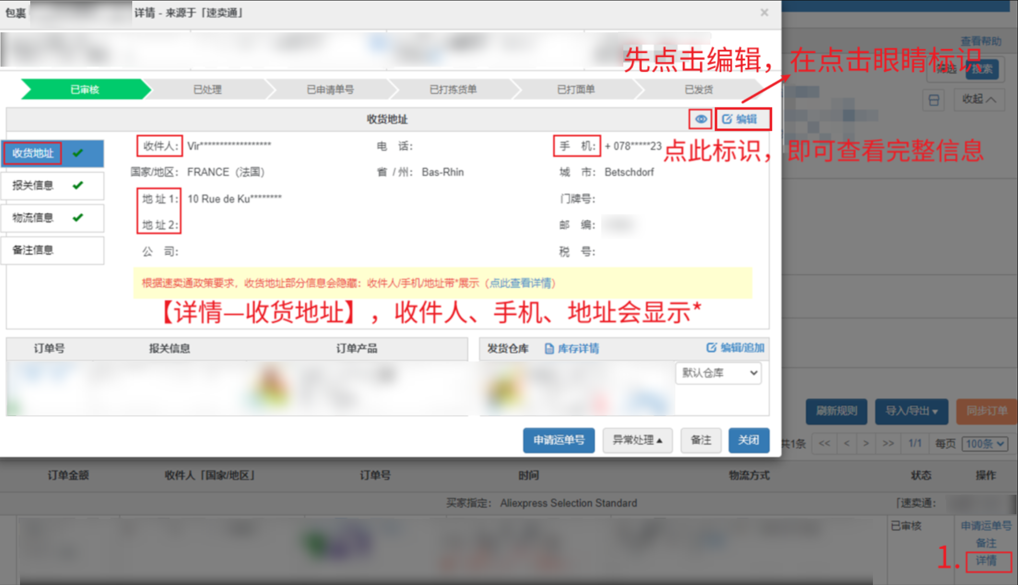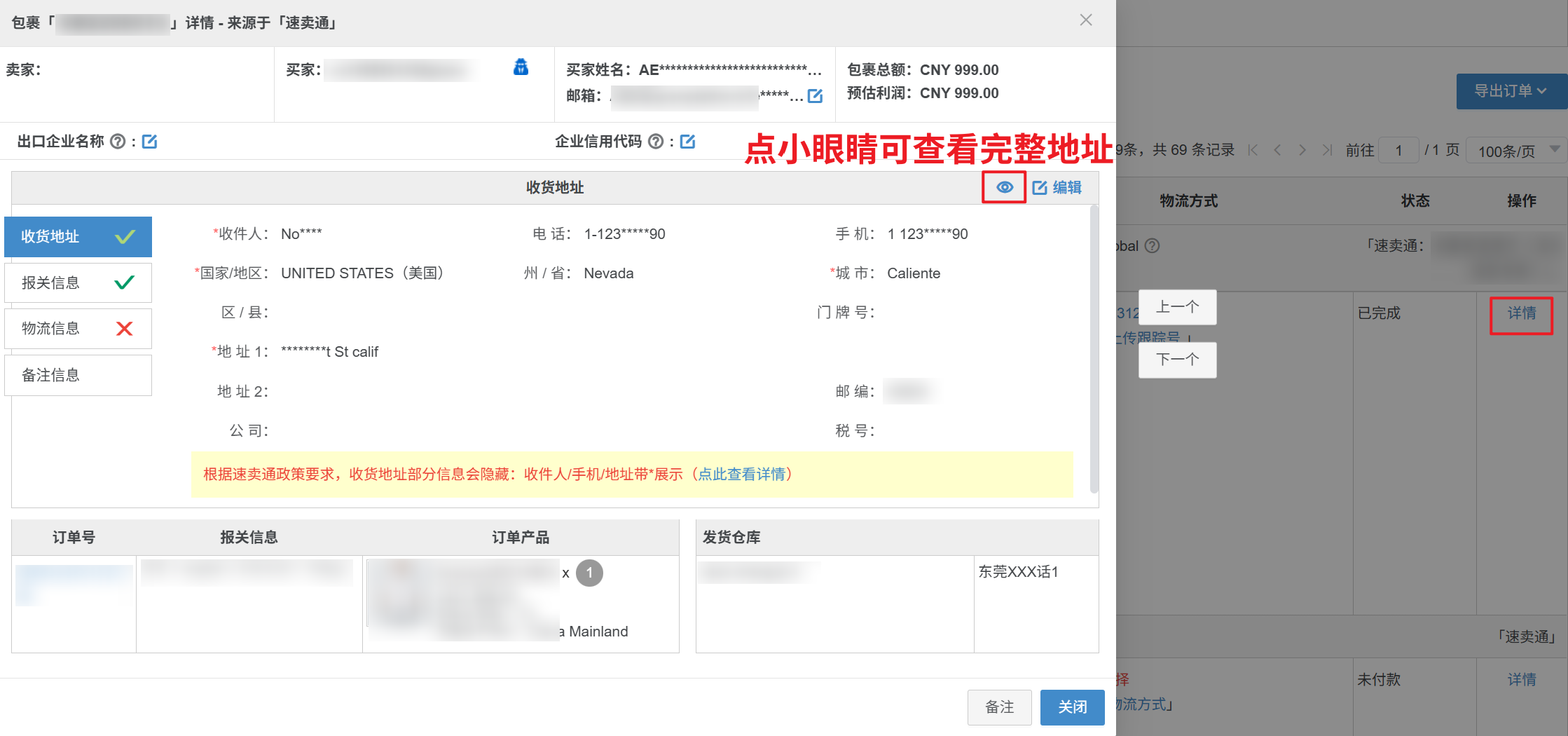 2、【再点击眼睛标识,这个时候会显示完整地址,再去修改买家要求修改的信息】,保存申请即可