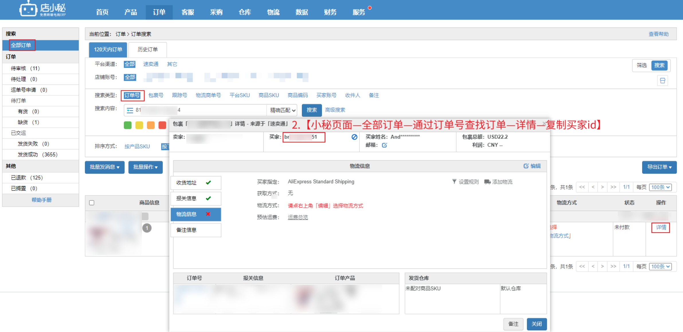 2、【小秘页面—全部订单—通过订单号搜索到订单】,点击【详情—查看买家id】