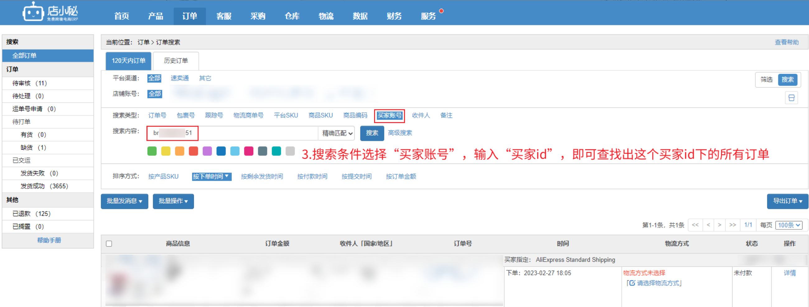 3、搜索条件选择【买家账号】,输入【买家id】,查找这个买家id下的订单