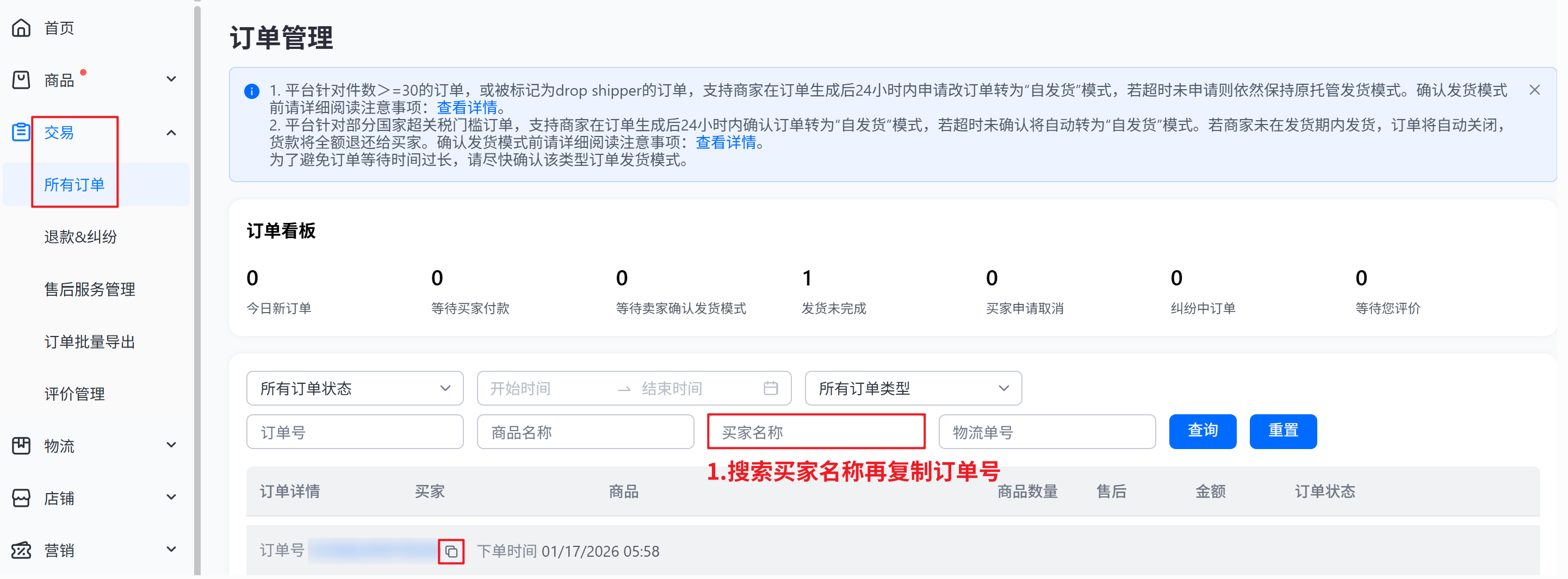 解决方案:1、【速卖通后台—交易】,通过买家姓名搜索下订单,复制一个订单号
