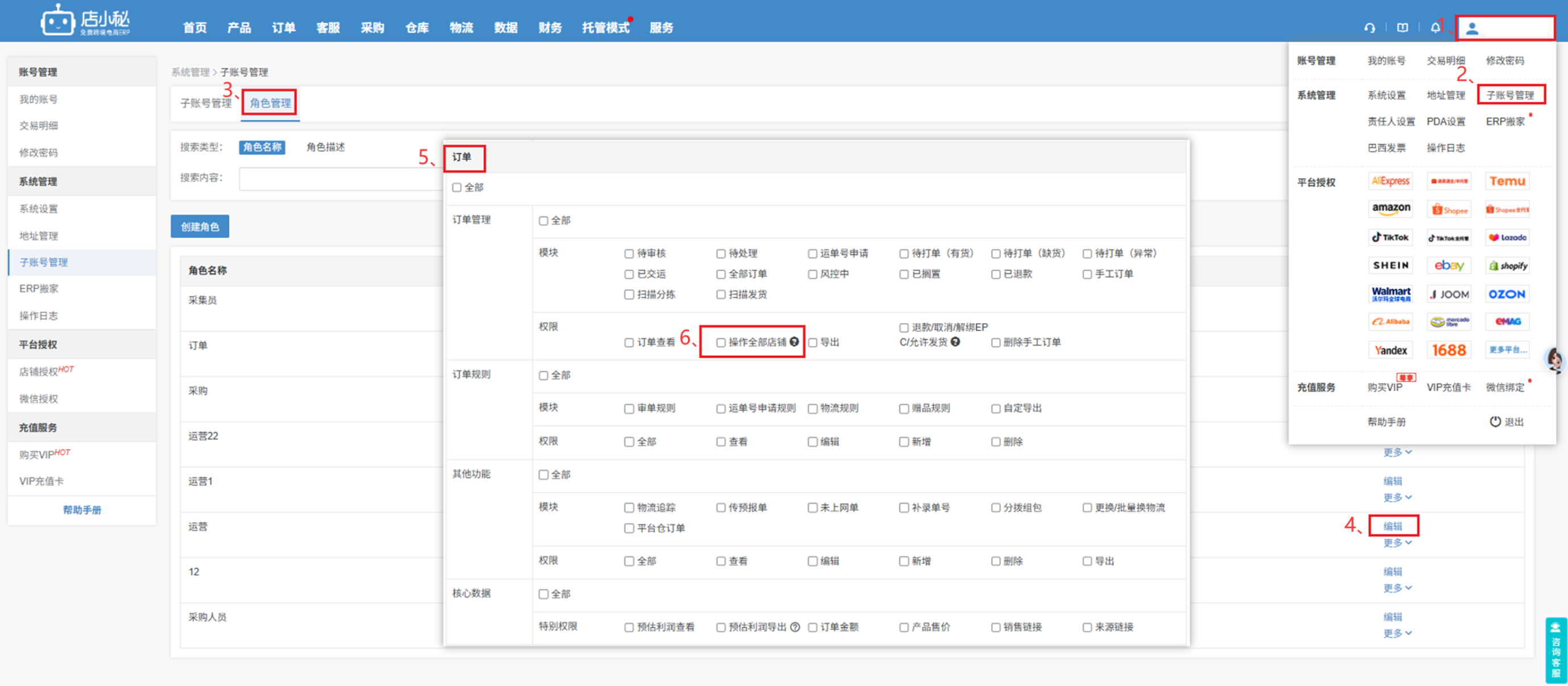 现象:平台渠道和店铺账号没有信息,可以查看订单,订单右上角显示【平台名称】原因:子账号没有这个店铺的权限,但在角色管理—订单里面有勾选操作全部店铺解决方案:【主账号—子账号管理—角色管理—对应角色编辑—订单—取消勾选操作全部店铺—保存】
