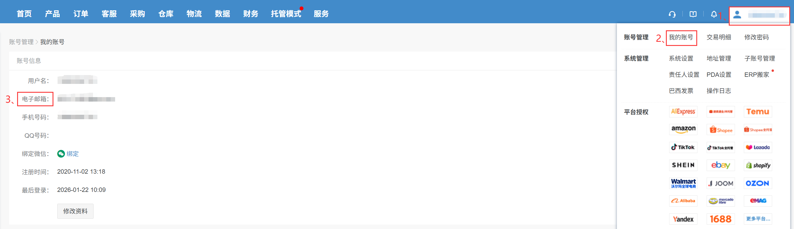 1、登录店小秘主账号—我的账号,查看绑定的邮箱和现在登录的邮箱账号是否一致