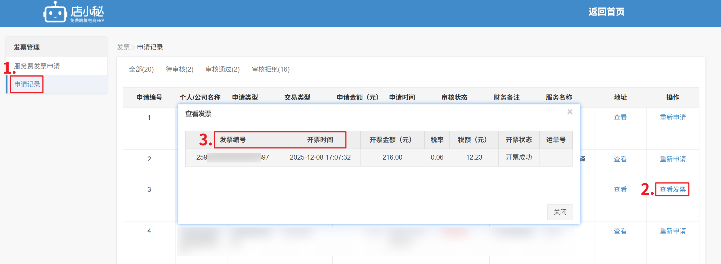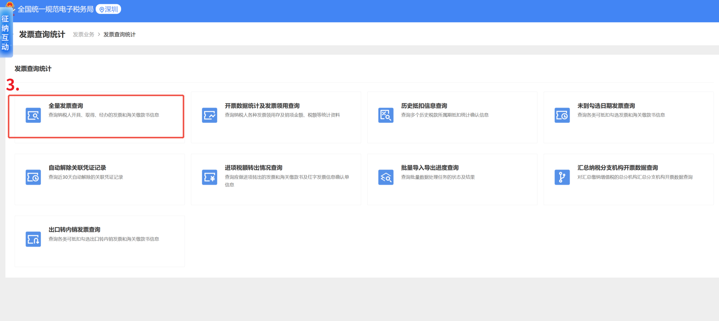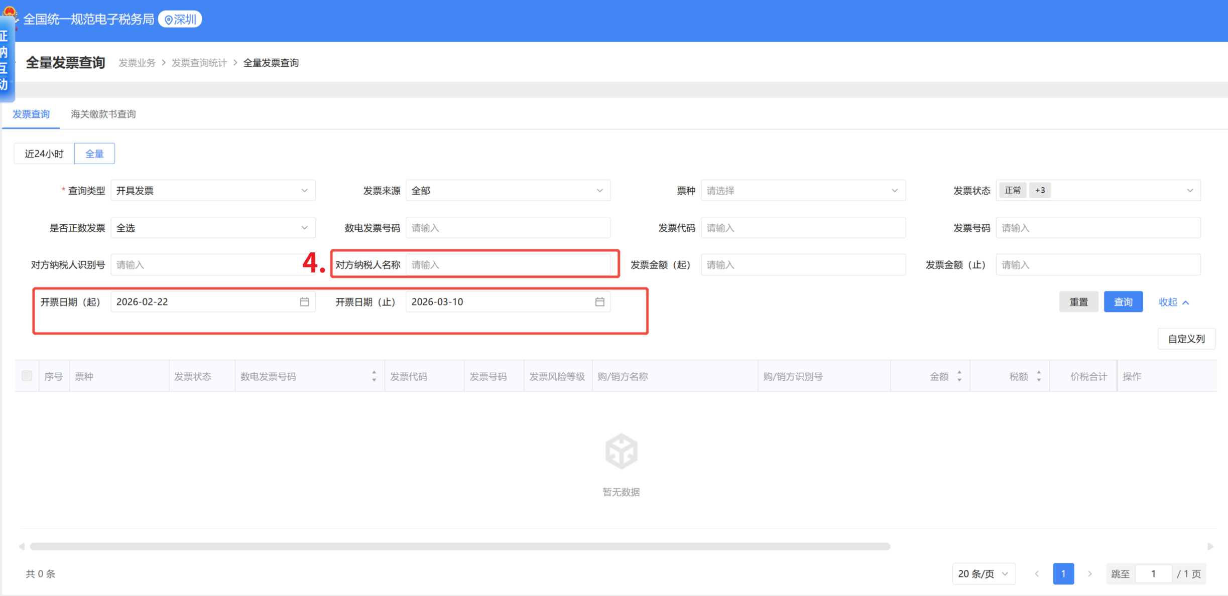② 点击发票查询统计—全量发票查询③ 根据收到的 “开票时间”、“发票编号” 信息,进行对应的检索方案二:进入邮箱,到垃圾箱、订阅箱等位置,查看是否有显示