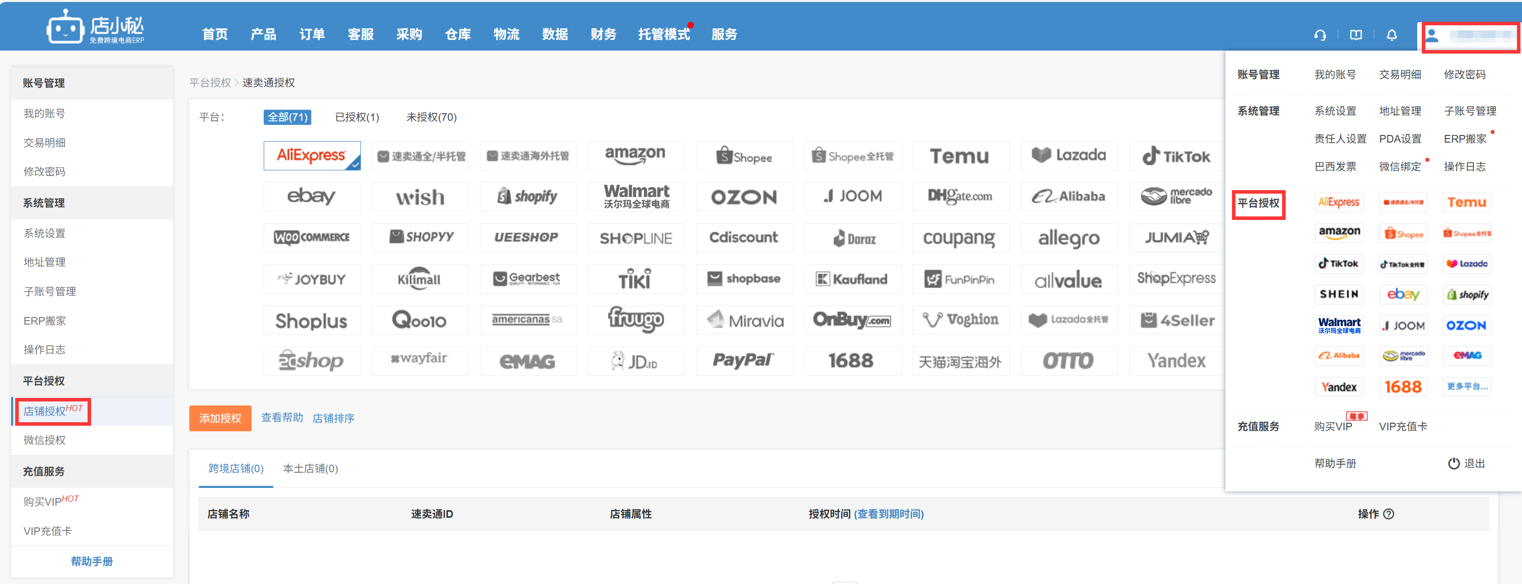 主账号:用户名—平台授权可以选择平台图标进行授权店铺