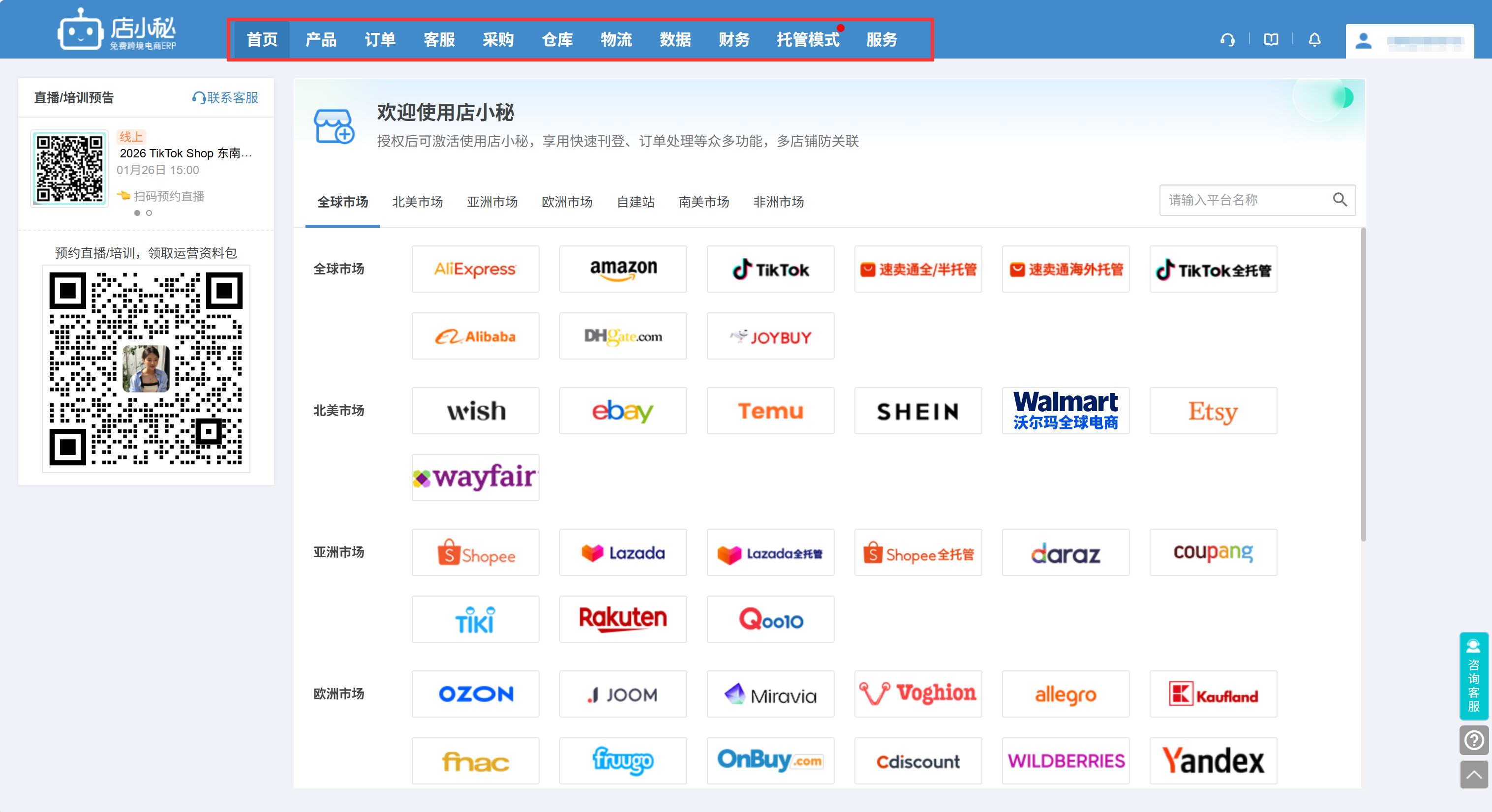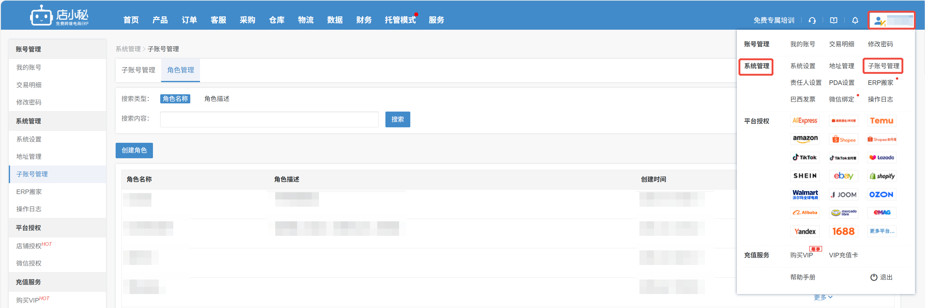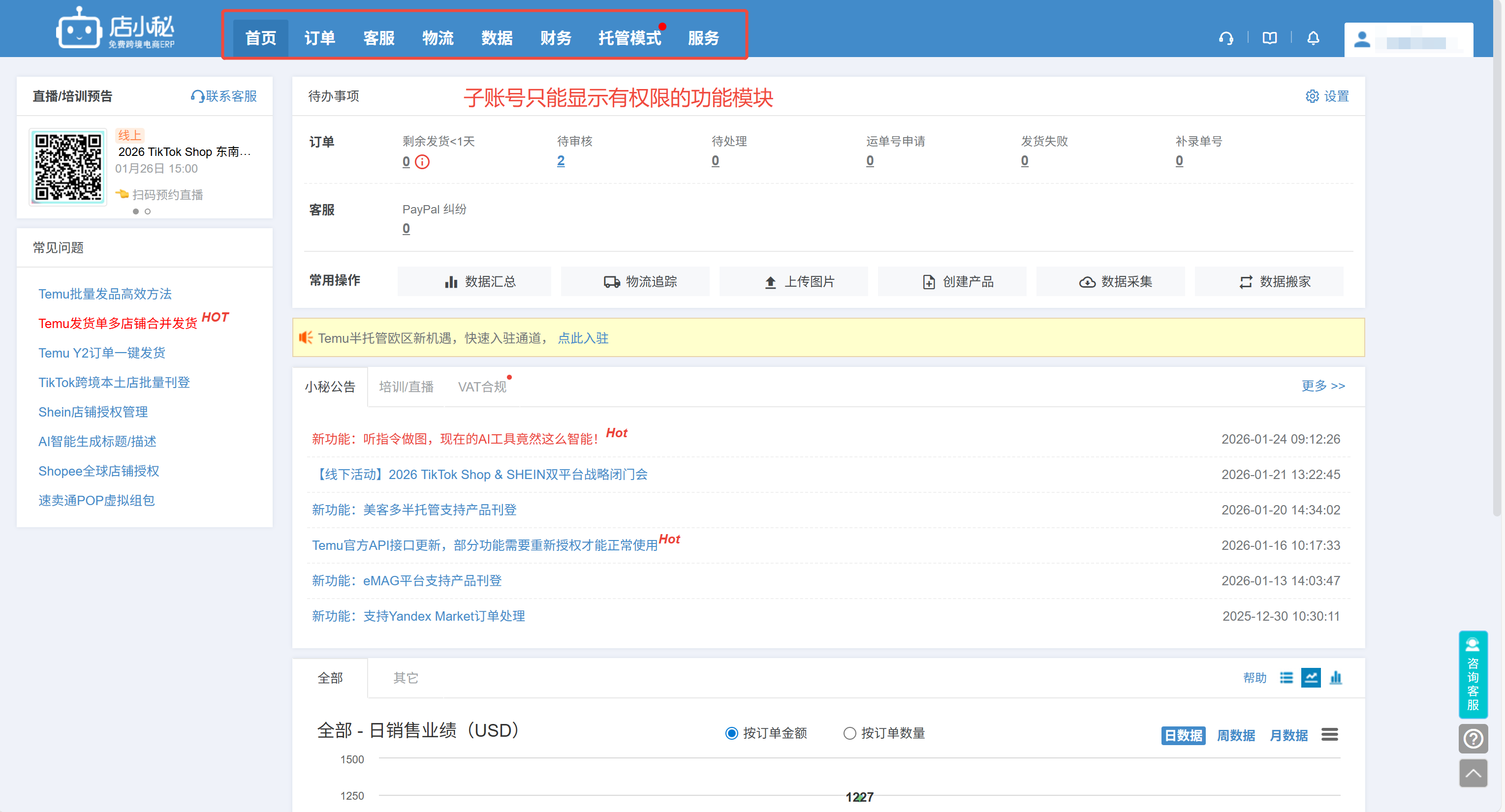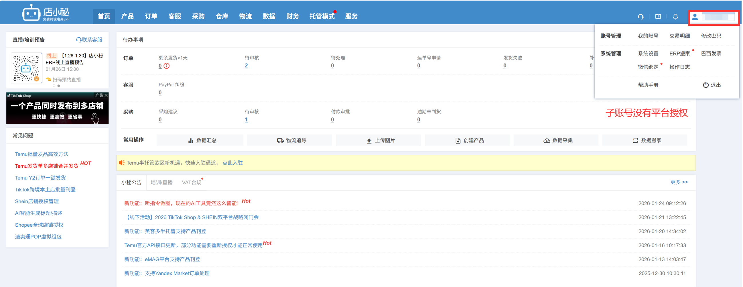 主账号:小秘页面上方会显示首页、产品、订单、客服、采购、仓库、物流、数据、财务、托管模式、服务共11个功能模块
