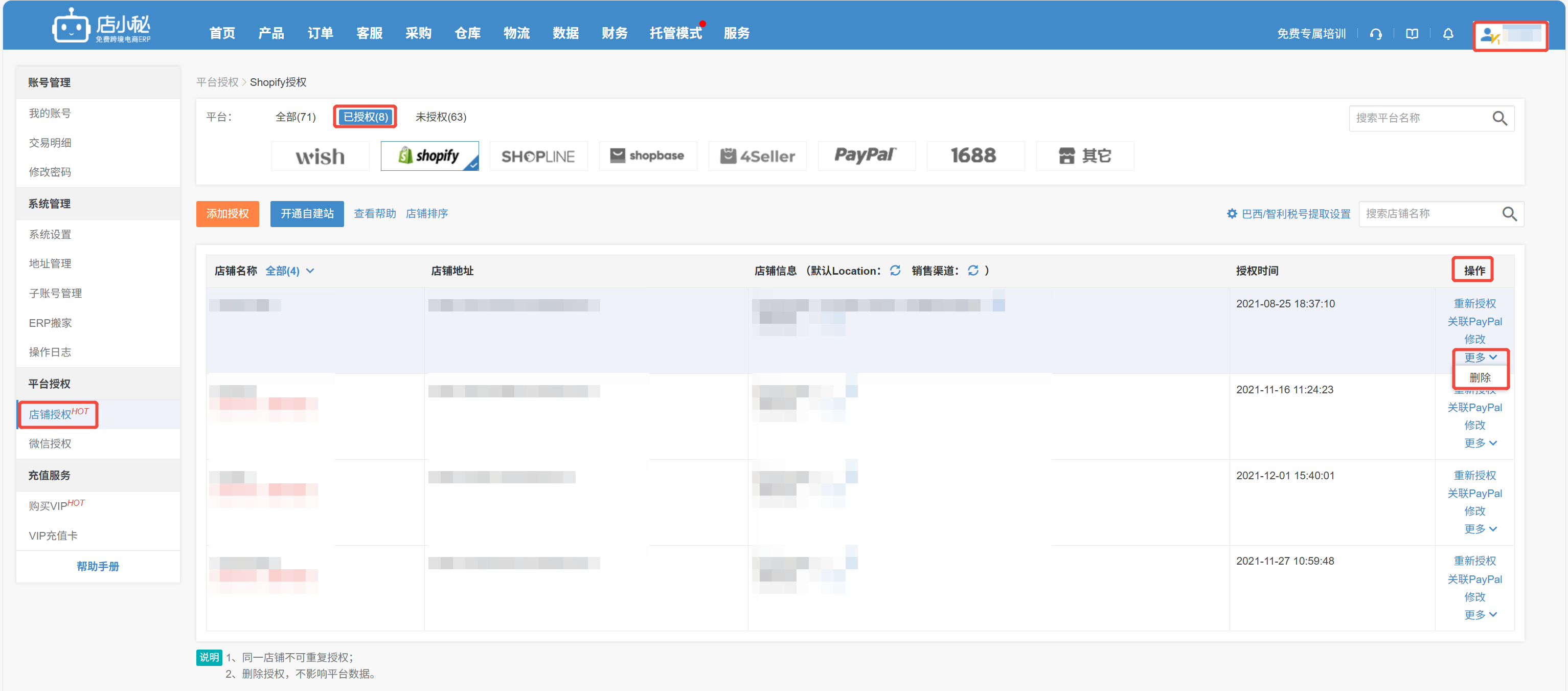 主账号:用户名—平台授权—店铺授权—已授权—操作位置有更多-删除按钮,可以删除授权店铺