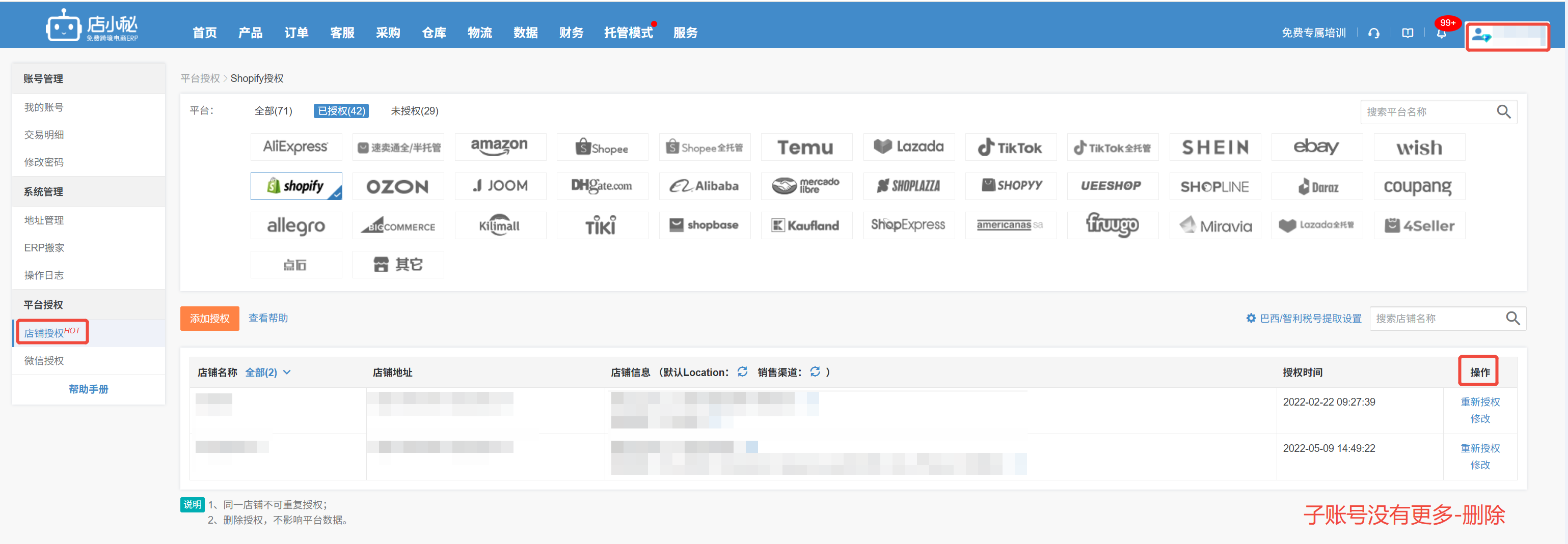 子账号:用户名—平台授权—店铺授权—已授权—操作位置没有更多删除的按钮,无法操作删除店铺