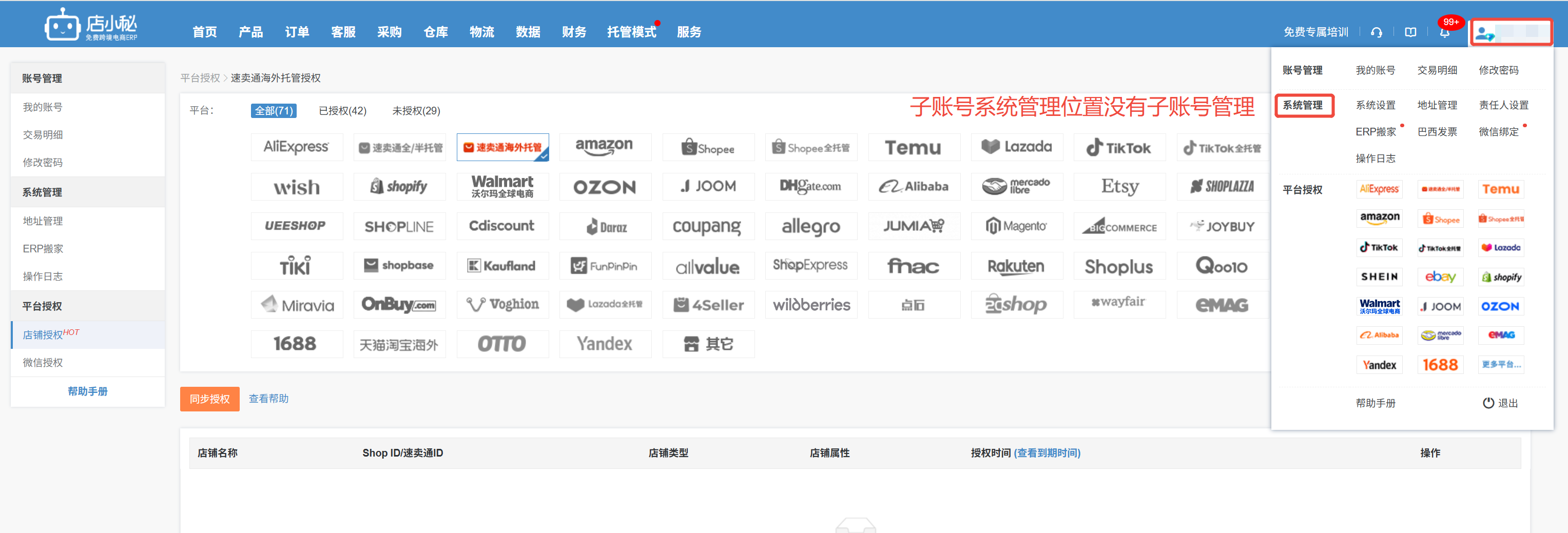 子账号:用户名没有显示平台授权,有显示平台授权说明主账号有设置店铺授权的权限,可以参考第三点进行区分