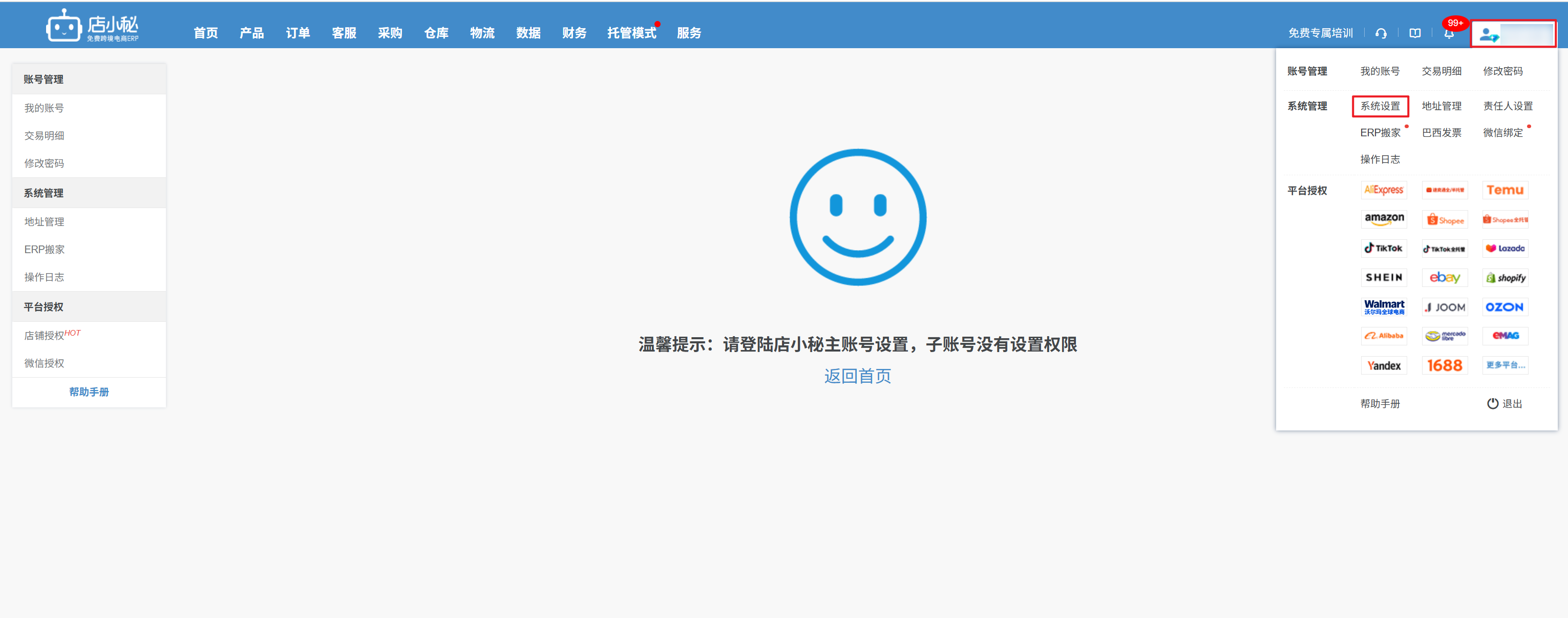 子账号:没有权限无法操作,点击会提示:请登陆店小秘主账号设置,子账号没有设置权限