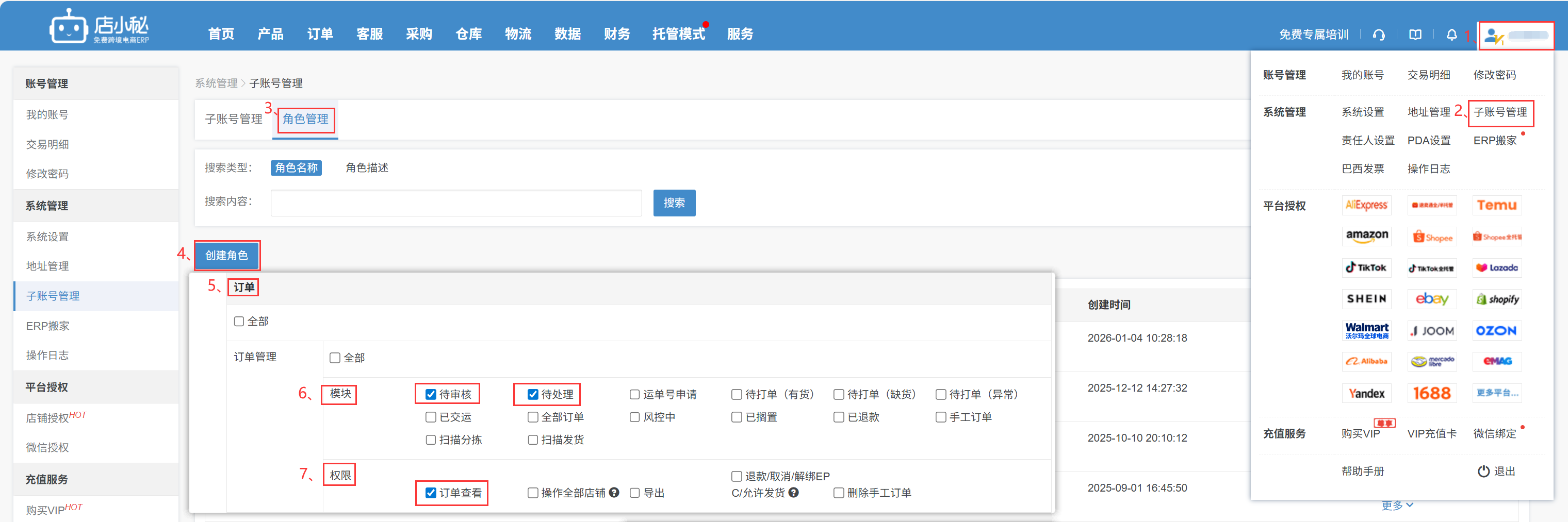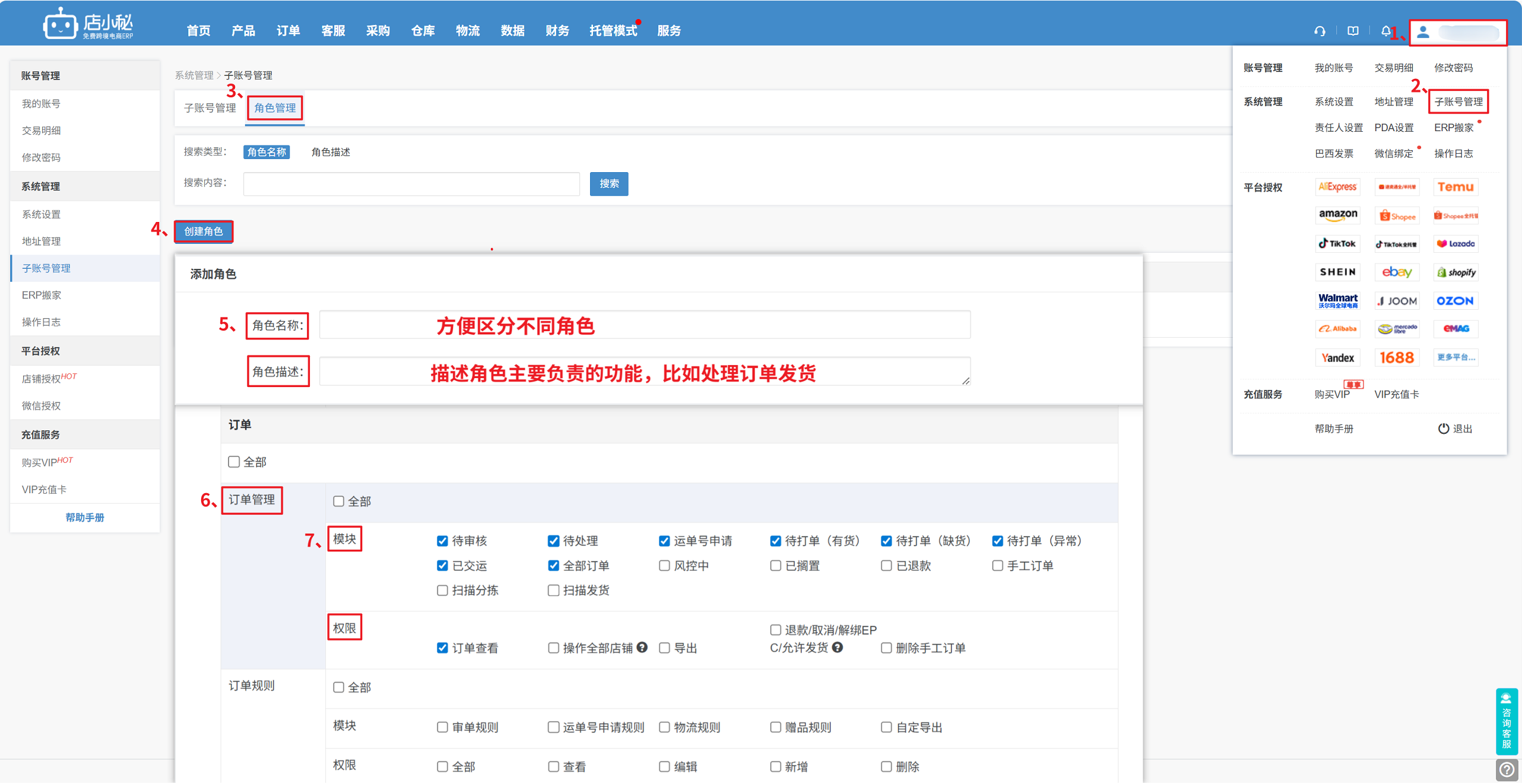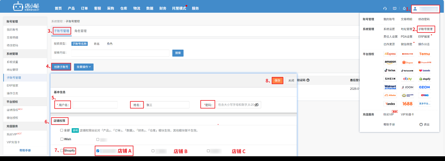 第二步:【子账号管理—创建子账号—基本信息填—勾选角色—店铺权限—保存】