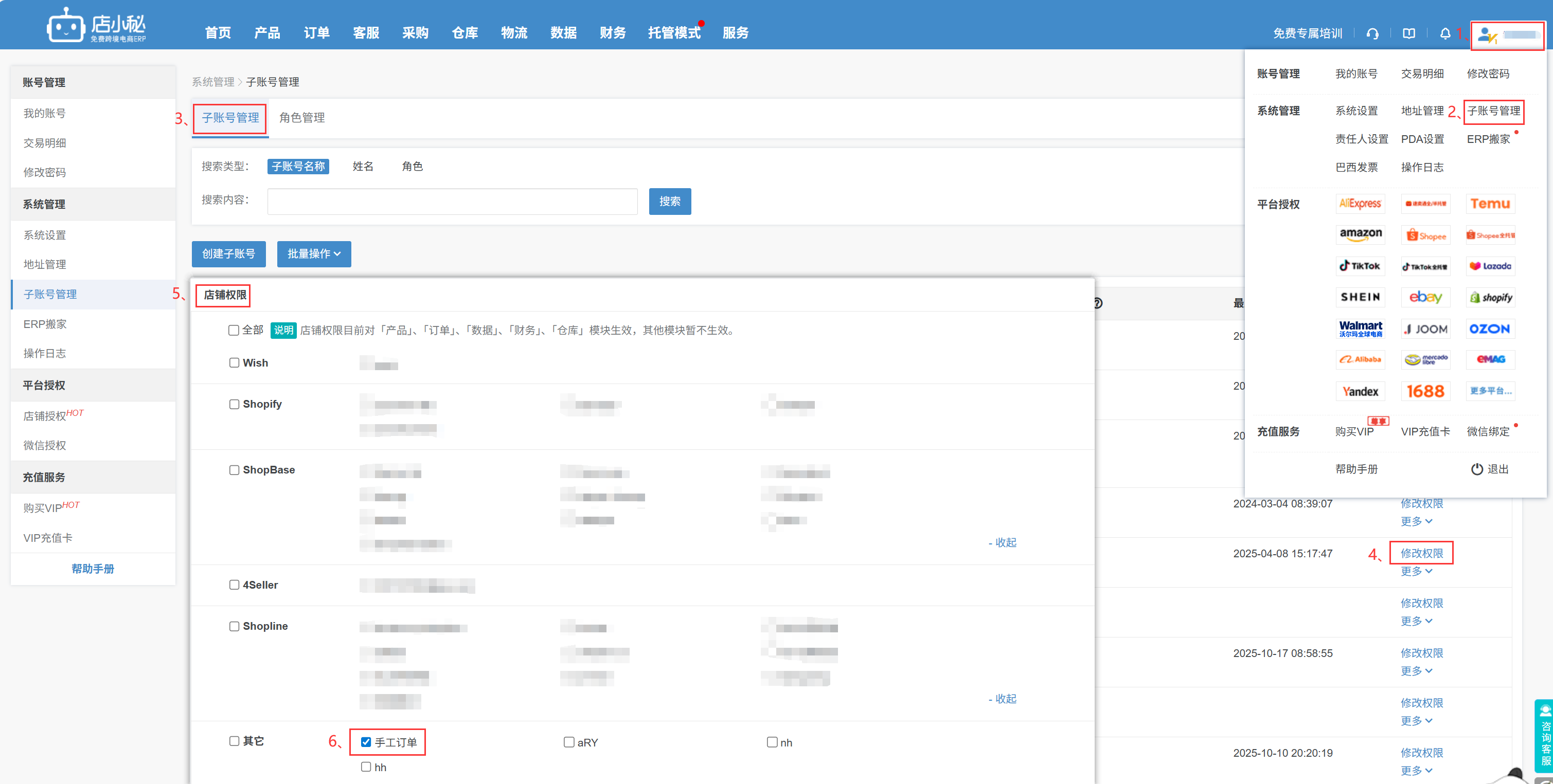 解决方案:【主账号用户名—子账号管理—修改权限—店铺权限—勾选对应平台店铺—保存】