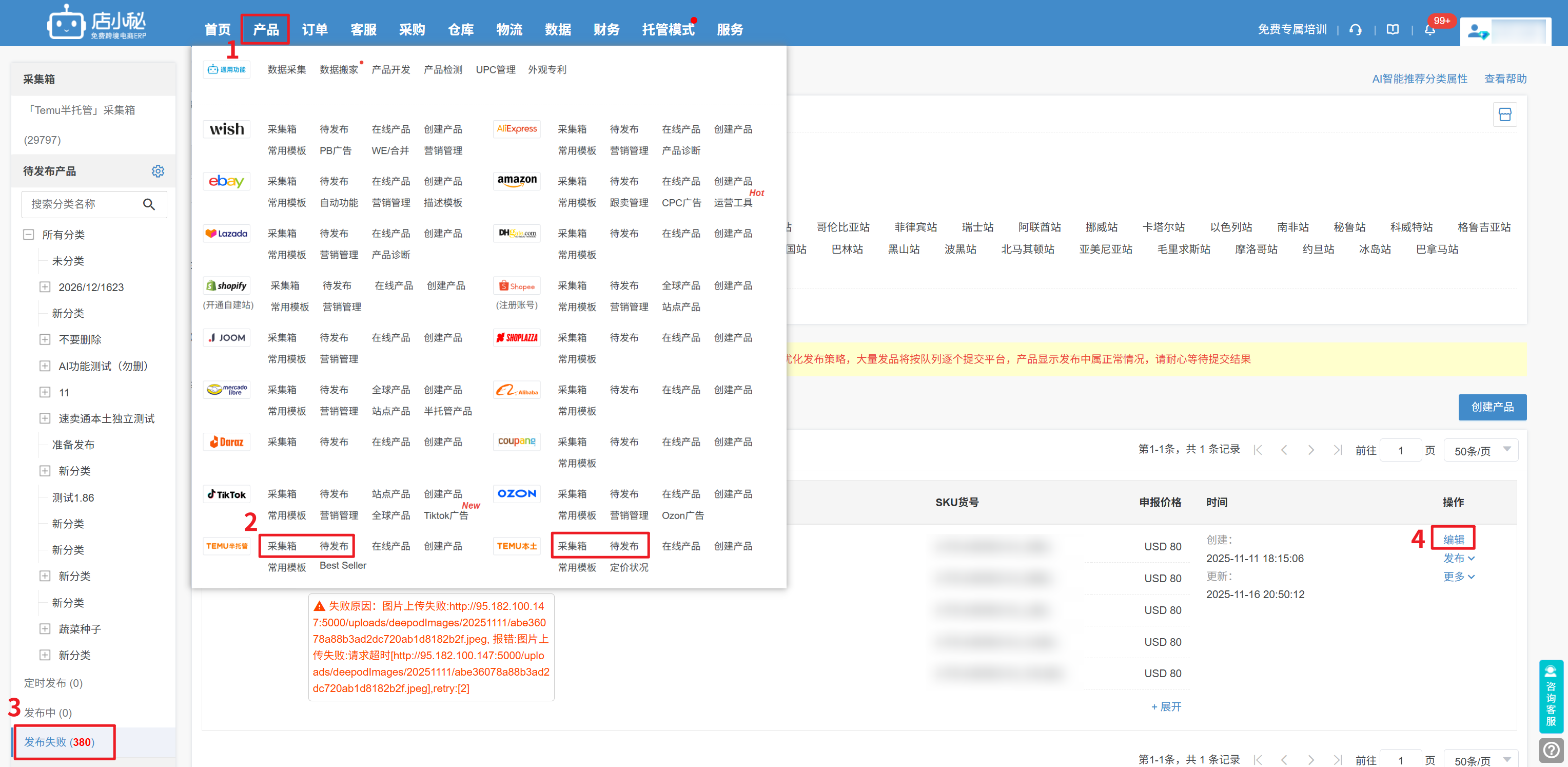 【产品—采集箱/待发布/发布失败—点击编辑—点击图片检测—把检测出来的图片批量修改大小/删除后再发布】